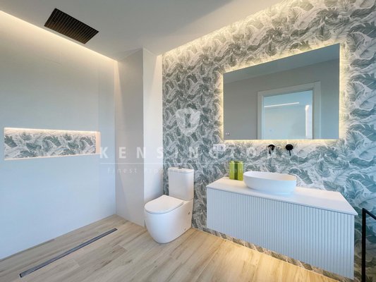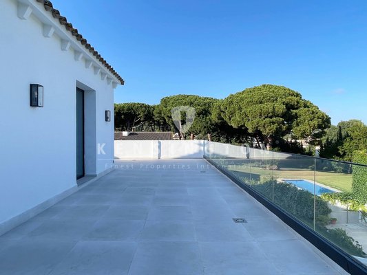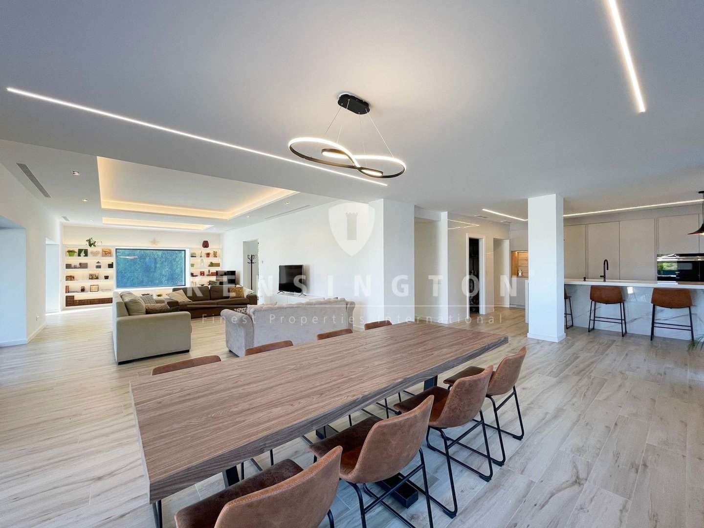 Das Erdgeschoss des Anwesens ist aufgeteilt in ein geräumiges Wohn-Esszimmer, Küche/Esszimmer und Veranda mit Blick auf den Swimmingpool und das Meer, eine Suite mit Zugang zu einem Innenhof, Büro, Waschküche, ein weiteres Schlafzimmer und ein Gästebad.