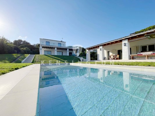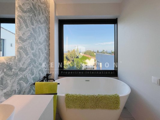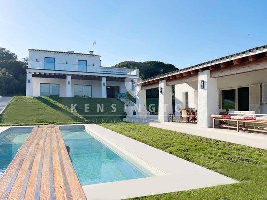 Das Erdgeschoss des Anwesens ist aufgeteilt in ein geräumiges Wohn-Esszimmer, Küche/Esszimmer und Veranda mit Blick auf den Swimmingpool und das Meer, eine Suite mit Zugang zu einem Innenhof, Büro, Waschküche, ein weiteres Schlafzimmer und ein Gästebad.