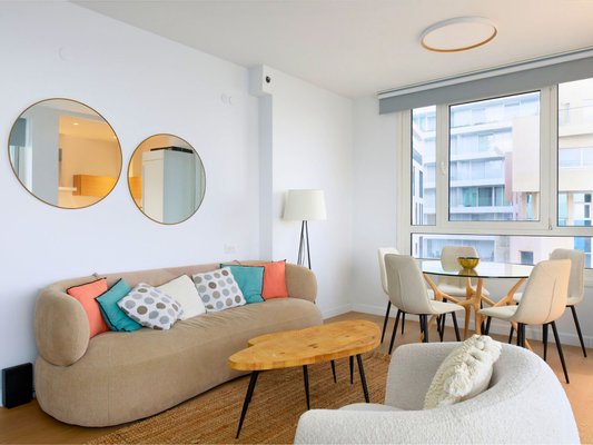 Eine atemberaubende 2-Zimmer-Wohnung an der ersten Linie zum Meer im Herzen von Tel Aviv, gelegen in einem Serviced-Apartmentgebäude mit direktem Blick auf die Promenade und den Strand, bietet ein Wohnerlebnis auf internationalem Niveau, das