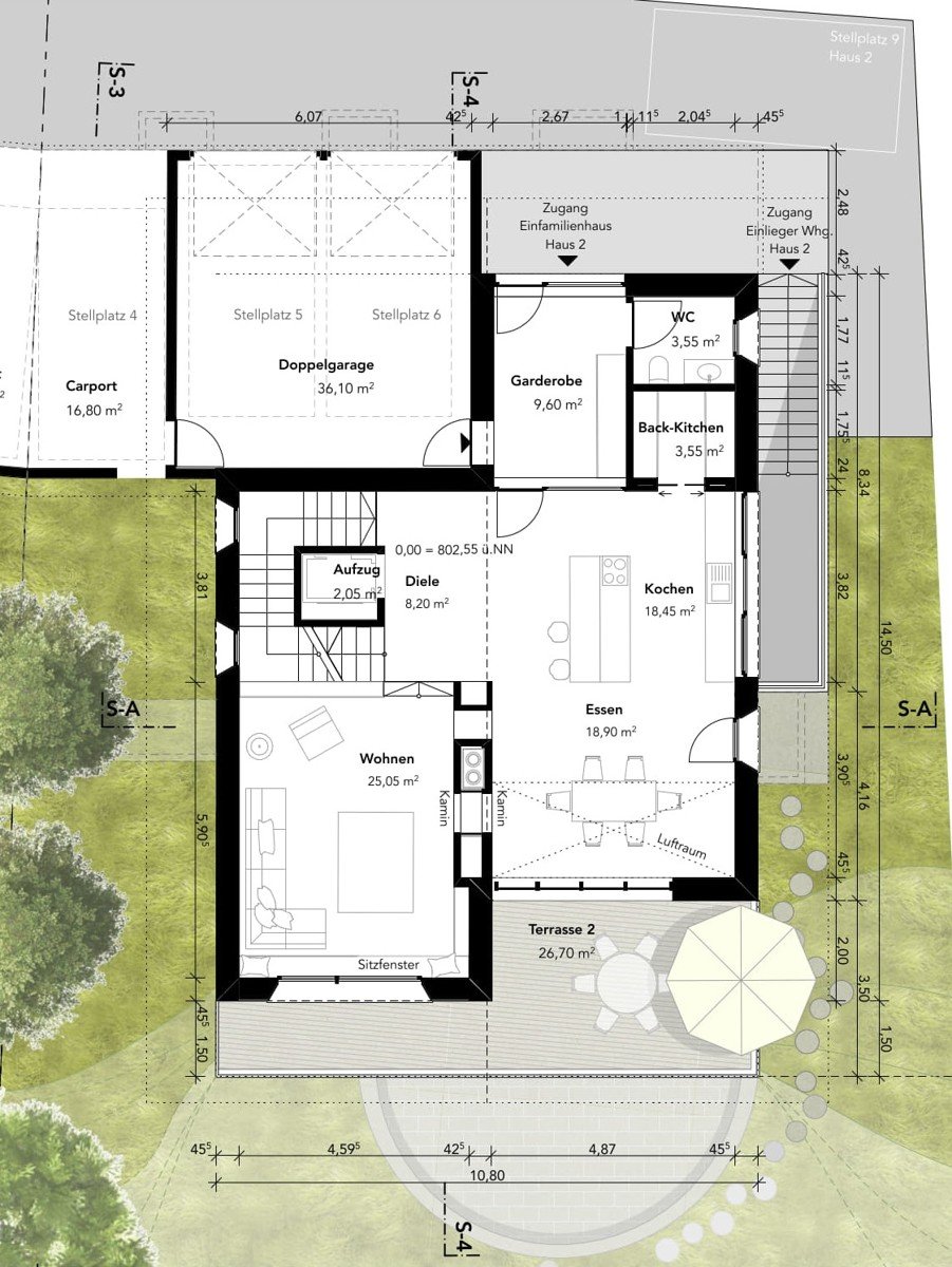Zur Verwirklichung Ihrer Wohnträume stehen Ihnen das Garten- und Fitnessgeschoss (Option: Sauna / Gym / Ruhebereich / Infinity-Pool), das Eingangsgeschoss, das Obergeschoss, sowie ein exklusives Panorama-Studio im Dachgeschoss mit zwei gut geschnittenen Zimmern und eigenem Bad zur Verfügung.