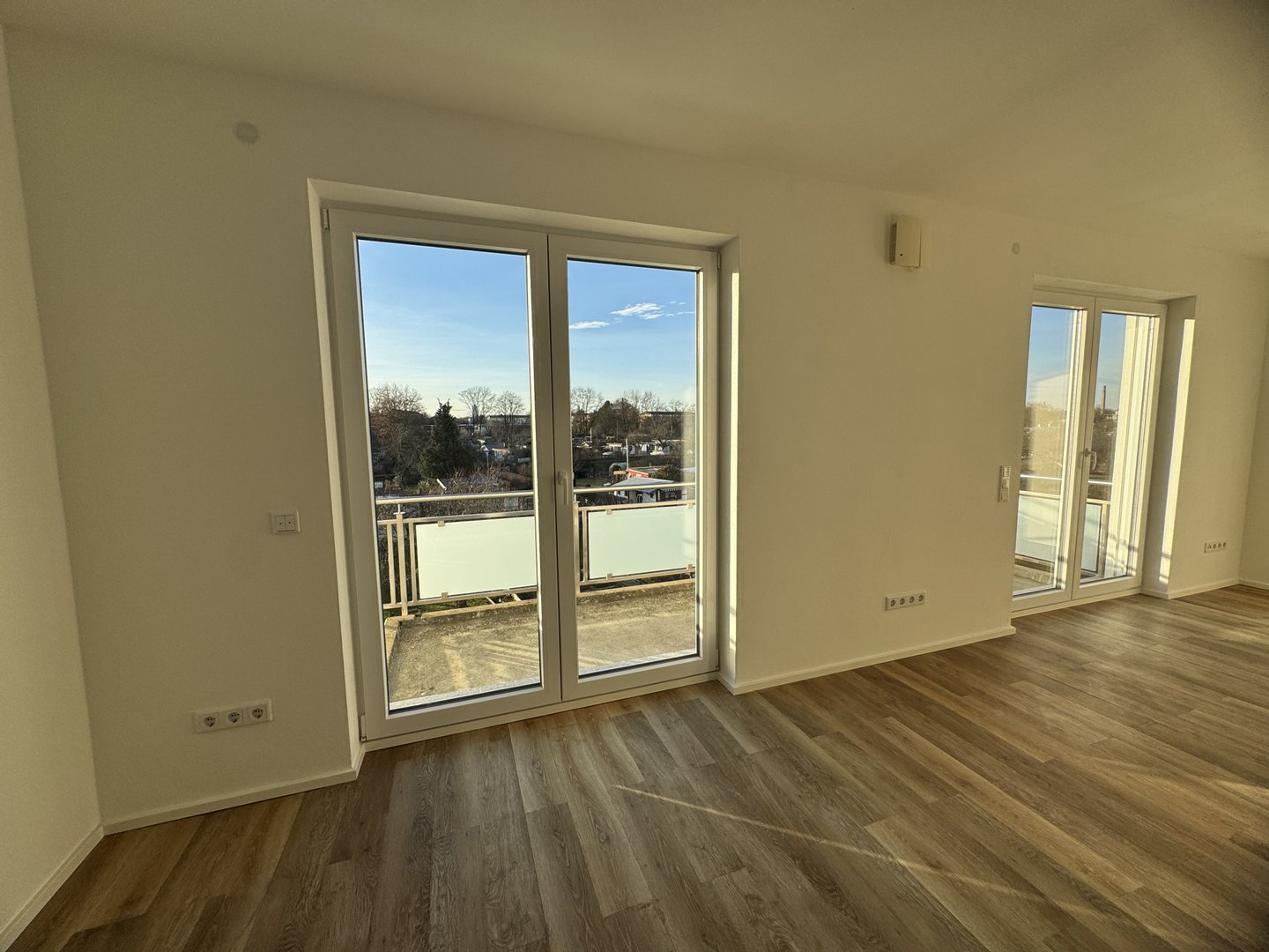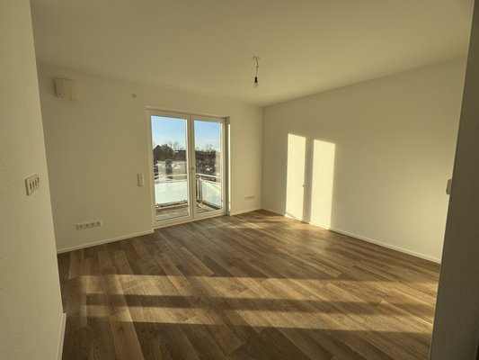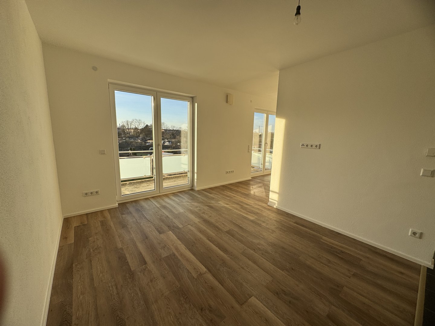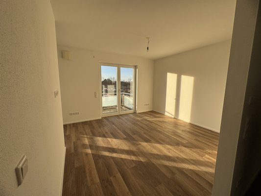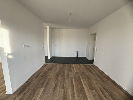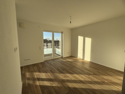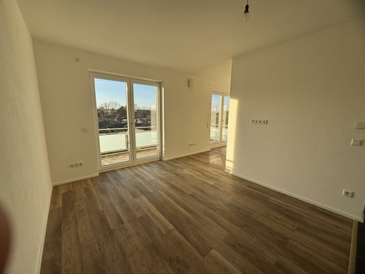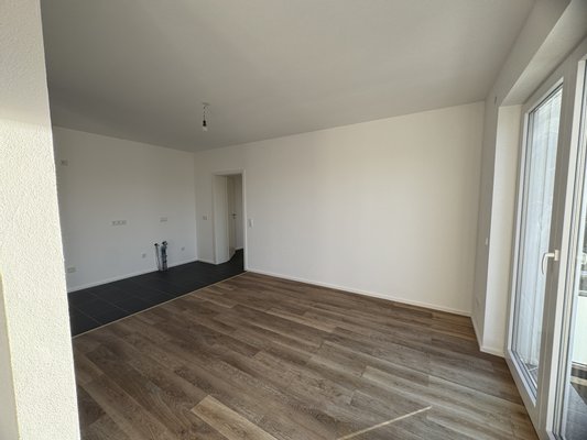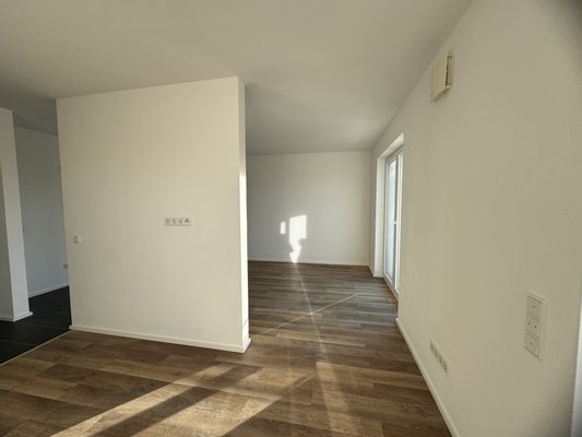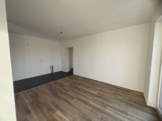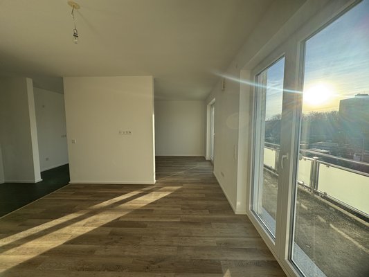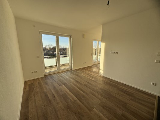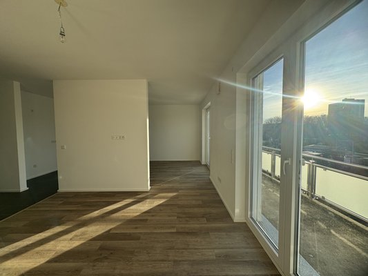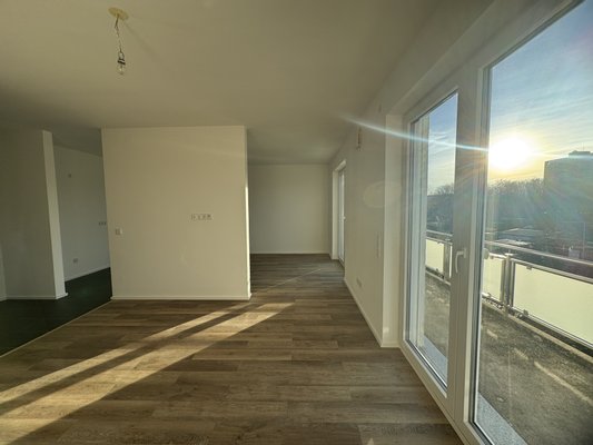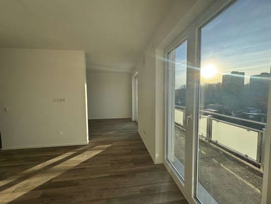 Der lichtdurchflutete Wohnbereich ist clever durch eine Zwischenwand getrennt und bietet so eine klare Aufteilung in Wohnzimmer sowie Essbereich mit integrierter Küchenzeile. Zwei große Fenstertüren sorgen hier nicht nur für ein offenes Raumgefühl, sondern führen direkt auf den großzügigen Westbalkon.