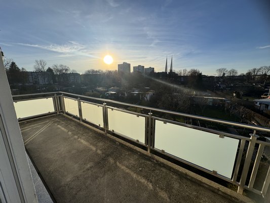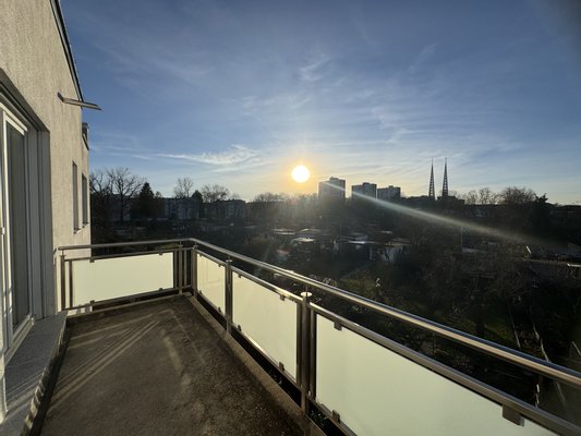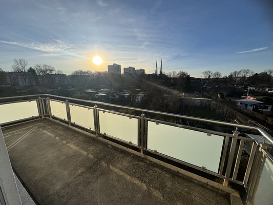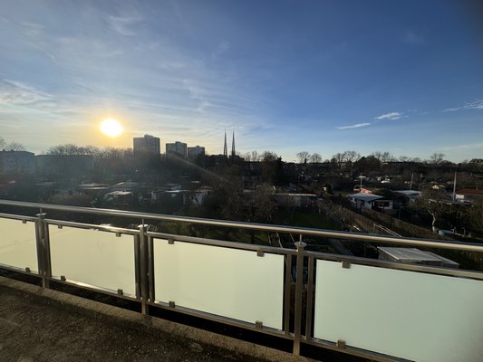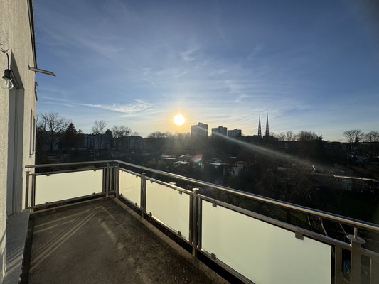 Von hier genießen Sie einen unverbaubaren Ausblick über Augsburg sowie ins Grüne mit Blick auf Schrebergärten – perfekt für entspannte Abende mit Sonnenuntergang.