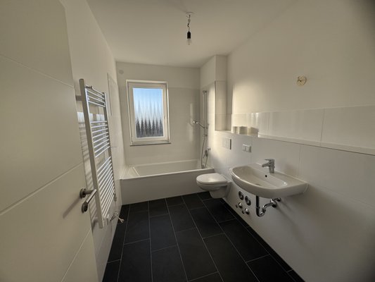 Das modern geflieste Badezimmer ist mit einer Dusch-Badewanne, einem Handtuchwärmer sowie einem eigenen Fenster ausgestattet und überzeugt durch Helligkeit und zeitgemäße Ausstattung.