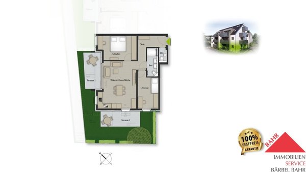 - Zwei Terrassen mit je ca. 10 m² und eigenem Gartenanteil von ca. 33 m²