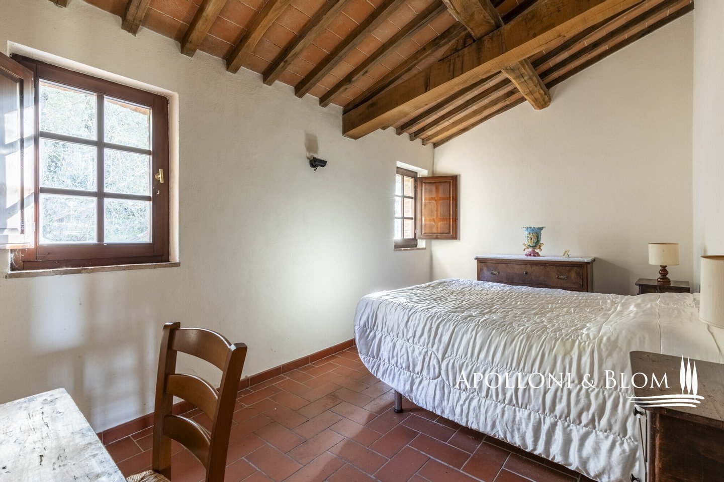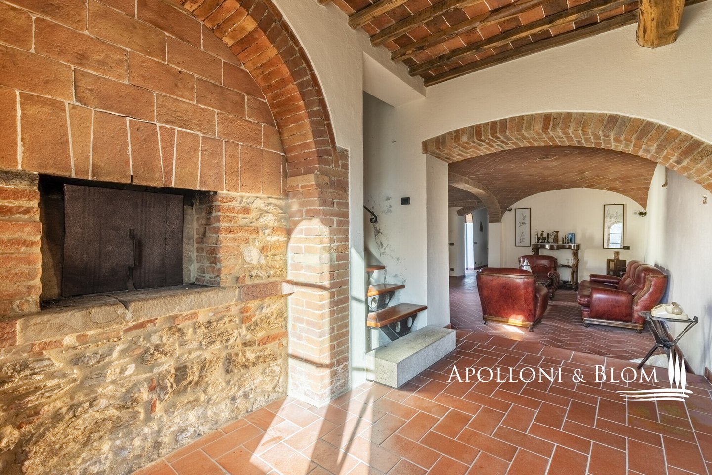 In hügeliger Lage, fein renoviertes klassisches Bauernhaus mit Solarenergie, Schwimmbad, Nebengebäude, landwirtschaftliches Grundstück mit großem Olivenhain, östlich von Siena zu verkaufen. Ein Wohnsitz mit großem Charme, der zeitlose Emotionen bietet. Eine perfekte Residenz für das Familienleben oder für die touristische Gastfreundschaft, dank der Anwesenheit von drei unabhängigen Einheiten perfekt in den Hauptteil des Gebäudes integriert. Nur wenige Minuten östlich von Siena und allen Annehmlichkeiten, dominiert dieses historische Bauernhaus einen sanften Hügel mit einem offenen, unendlichen Blick auf die toskanische Landschaft. Die Lage ist privat, aber nicht isoliert, über eine kurze unbefestigte Straße erreichbar und von über 19 Hektar Land umgeben, darunter ein Garten, ein Panoramaschwimmbad und 18 Hektar Olivenhaine. Das Bauernhaus aus dem Jahr 1700 wurde sorgfältig restauriert und erstreckt sich über fünf Etagen mit einer Gesamtfläche von 464 Quadratmetern, die in einem charmanten Türmchen mit einer Terrasse und einem grenzenlosen Blick auf die sienesischen Hügel gipfelt. Die Innenräume bewahren den Charme der ländlichen toskanischen Architektur: im Erdgeschoss ein traditionelles Wohnzimmer mit gewölbten Decken, im ersten Stock hohe Decken mit freiliegenden Holzbalken, Terrakottaböden und ein großer zentraler Kamin, der zum Herzstück des Wohnbereichs wird. Im ersten Stock befindet sich ein großes Wohnzimmer mit zentralem Kamin und einer offenen Treppe, die zum Türmchen führt, ein Hauptschlafzimmer mit Arbeitszimmer, Leseecke und eigenem Bad sowie zwei weitere Schlafzimmer und ein Bad. Im Erdgeschoss gibt es neben der Hauptküche eine kleine Küchenzeile mit Speisekammer und einen großen Raum für die Wäsche. Neben dem Bauernhaus wurde eine zweistöckige Hütte restauriert, in der Gäste oder Personal untergebracht sind, sowie eine Garage mit zwei Parkplätzen. Ausgestattet mit allen modernen Annehmlichkeiten, einschließlich effizienter Installationen, Solar- und Fotovoltaikanlagen und Fußbodenheizung im Hauptteil. Der Zustand ist ausgezeichnet und die Immobilie wird voll möbliert angeboten, so dass sie sofort bewohnt werden kann. Ein geschichtsträchtiger Ort, der leicht zu erreichen und gut an das Hauptstraßennetz angebunden ist.