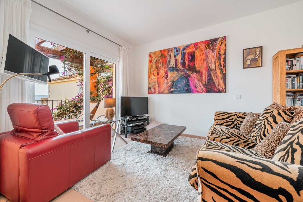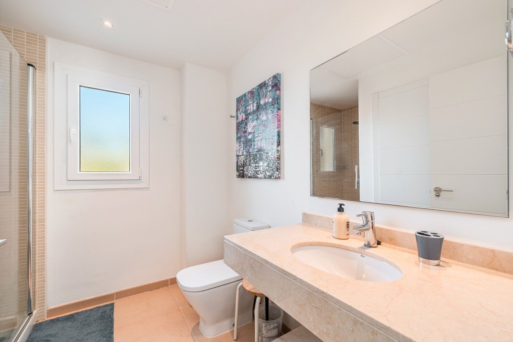 Die Wohnung verfügt über zwei großzügig geschnittene Schlafzimmer und zwei moderne Badezimmer, darunter ein geräumiges En-Suite-Badezimmer, das Privatsphäre und Komfort gewährleistet. Die Innenräume sind lichtdurchflutet und gut geschnitten und bieten eine harmonische Balance zwischen Funktionalität und moderner mediterraner Eleganz.