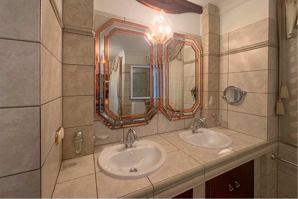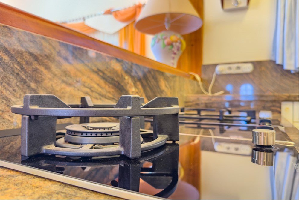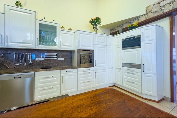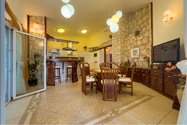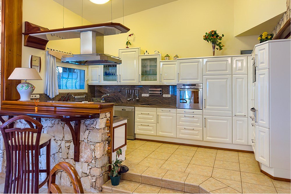 Einrichtung und Küche: Hochwertige Mahagonimöbel und eine voll ausgestattete Küche (Gas + Strom, Granitarbeitsplatte).