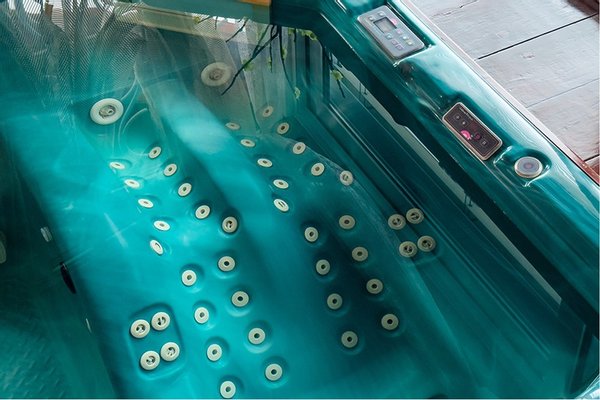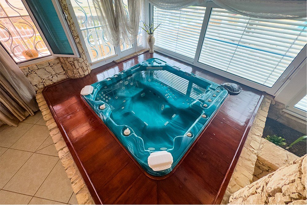 Privater Freizeitbereich: Die Außenansicht ist ein echter Rückzugsort mit einem 6-Personen-Jacuzzi, einem überdachten Außenpool und einem gepflegten Garten.