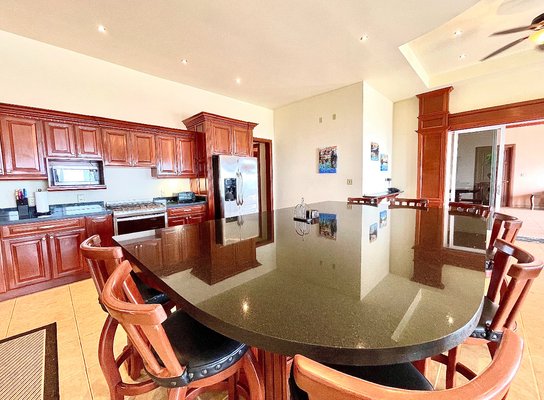 Villa Papagayo "Villa Papagayo", as this spectacular home is called, sits on a titled lot of 4693.76 square meters (+1 acre) within the gated community of Morrillo Pacific Heights, with views of the Pacific Ocean and direct sunsets. Ideal for families or large groups, the main level of this luxurious, fully furnished home has 390.31 (4,200.64 square feet) of enclosed living space, plus a huge pool and deck. The additional level includes three independent luxury suite-style apartments (1-bedroom efficiencies, each with its own kitchen and bathroom), which share a plunge pool and a spacious terrace overlooking the vast ocean. You and your guests will be greeted with an imposing double-height entrance with wood-encrusted ceiling, leading to an open dining area and butler bar area, seating more than 20 people easily. Interior Layout & Social Areas Living Room & Kitchen: The large enclosed living room with a huge open kitchen features luxury finishes and appliances, including a spacious pantry and two more guest bathrooms. Living Room: It is very spacious (73.21 m2 / 788.00 sq ft), enclosed with air conditioning, with sliding glass windows and doors for open views of the ocean and pool, high-end mahogany wood cladding on walls and doors. It is fully equipped with 2 large comfortable sofas and multiple chairs to seat more than 10 people, plus a huge 48" smart TV and a spacious guest bathroom with high-end finishes. Sliding glass doors are designed to offer the flexibility to leave the space open to cool morning or evening breezes. Kitchen: It is open to the living room and is very spacious (16.85 m2 / 181.34 sq ft) with views of the ocean and pool, beautiful granite countertops and high quality hardwood cabinetry. It is fully equipped with high-end appliances (gas stove, full-size oven, full-size refrigerator, microwave, dishwasher, etc.) and includes a massive granite bar and chairs that can seat up to 8 people. Pantry: Conveniently located behind the kitchen, it is very spacious (7.38 m2 / 79.45 sq ft) with hardwood cabinets and shelving and a large freezer for additional storage. Dining and Service Areas: Dining: The massive dining room (103.50 m2 / 1114.0647 sq ft) is located at the main entrance, with double-height ceilings with hardwood paneling. It's an extensive outdoor dining area with a hardwood table for groups of up to 20 people, a full guest bathroom, and a butler cocktail bar. It is completely covered but open to the ocean breeze. Laundry room: Very spacious, air-conditioned, equipped with washing machine, dryer and sink. Adjacent is a small bedroom with a bunk bed for 2 service staff (or children) who can use the shared full bathroom in the dining area. Garage: Very spacious (40.2 m2 / 432.71 sq ft), with a new aluminum automatic door (American quality) and an access door to the outside patio. Master Bedrooms Master Bedroom: Very large (45.5 m2 / 489.76 sq ft), furnished with king size bed, desk and large sliding glass doors overlooking the ocean. Includes dressing room (9.55 m2) with custom mahogany furniture. The en-suite bathroom (15 m2) includes double sinks, a large ceramic bathtub and a separate oversized shower. Second Bedroom: Very spacious (22 m2 / 236.81 sq ft), with king size bed, desk, double height ceilings, split air conditioning, walk-in closet and large bathroom with tub plus separate shower. Guest Suite Apartments On the ground floor, below the pool terrace, there are three independent, fully furnished and air-conditioned suite apartments: Each has its own full luxury kitchen, spacious bathroom and closet. They share a small plunge pool and a large open terrace overlooking the ocean. They have independent side access and a private laundry room. Dimensions: Suite 1 (39.56 m2), Suite 2 (39.58 m2), Suite 3 (41.75 m2). Construction Specifications and Total Areas The total built area of the house is 1250 square meters (13,454.88 square feet), broken down as follows: Enclosed space on the upper floor: 500 m2. Open but covered space: 170 m2. Open space: 575 m2. Construction Details: Concrete block walls and cast concrete columns. Fiber cement ceiling (Panalit) with ceilings decorated with hardwood. Double pane PVC windows and sliding doors. Stainless steel exterior railings. Location, Access & Environment Location: Within the gated community of Morrillo Pacific Heights. The property offers 180-degree views of the Pacific Ocean and sunsets. It is only 1 km from Playa Mata Oscura, allowing you to hear the waves from the house. Access: New and paved road from the Pan-American Highway in Santiago to the community. From Panama City: 5 hours total trip. Flights: You can fly from Albrook to Santiago by charter flight. Nearby Beaches and Activities: Playa Mata Oscura (1 km): Turtle nesting and sport fishing in Puerto Nance. Playa Morrillo (10 km): Famous for world-class surfing. Playa Torio and Playa Reina: 20-40 minutes away. Nature: Proximity to Cerro Hoya National Park, waterfalls, whale watching and islands such as Cebaco and Coiba. Services, Shopping & Health Shopping: Bramador Supermarket 9 km away. In Mariato (main town) there are banks, hardware stores, hospital and government offices. Health: Emergency center in Mariato (30-40 min). Largest hospitals in Santiago (1.5-2 hours) and world-class facilities in Panama City. Education: Local public schools in the area. Most expats use online homeschooling. Utilities and Monthly Electricity Expenses: $0.22/kWh (independent meters). Water: Communal spring water well ($10/month). Backup: Propane gas generator (Generac) and fiber optic internet. Taxes: Exempt from property taxes (zero taxes). Summary of Monthly Expenses (Estimated +/- $1200): Electricity: $250-$500 Internet: $51.53 Water: $10 HOA Maintenance: $105 House, Pool and Garden Maintenance: Approximately $370 Cleaning: $300 (3 days per week) Fixed Annual Expenses: +/- $1700 / Total Annual Expenses (Fixed + Variable): +/- $13,700 Property Description in English: Villa Pa
