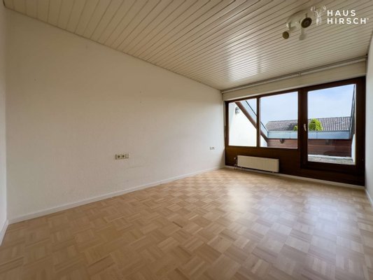 Die gelungene Raumaufteilung schafft eine angenehme Wohnatmosphäre. Der Wohn- und Essbereich überzeugt durch seine großzügige Deckenhöhe bis zum First, was im Sommer ein besonders angenehmes Raumklima garantiert. Hochwertige Bodenbeläge wie Parkett im Wohn- und Schlafzimmer sowie moderne Fliesen in den übrigen Bereichen unterstreichen die Qualität der Ausstattung.