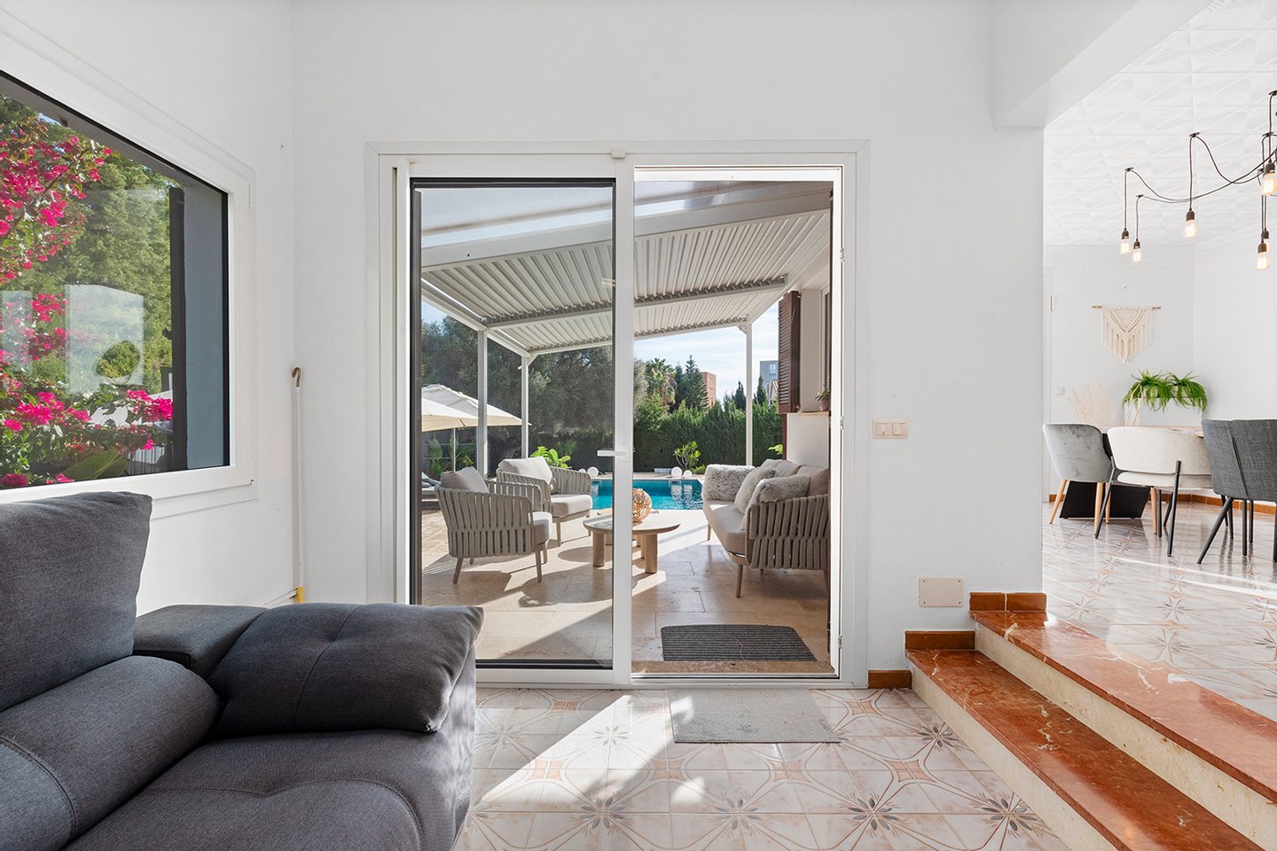 Im Erdgeschoss befindet sich der Wohn-und Essbereich mit einer angeschlossenen Küche die keine Wünsche offen lässt. Von der Küche, wie auch vom Wohnzimmer gelangt man in den Garten mit seinen Terrassen und den beheizbaren Salzwasserpool. Ein Duschbad rundet das Erdgeschoss ab.