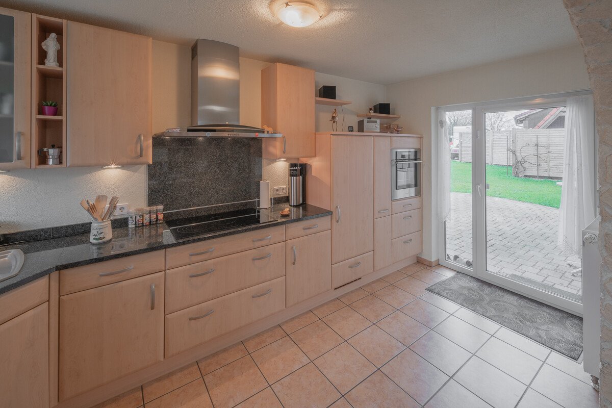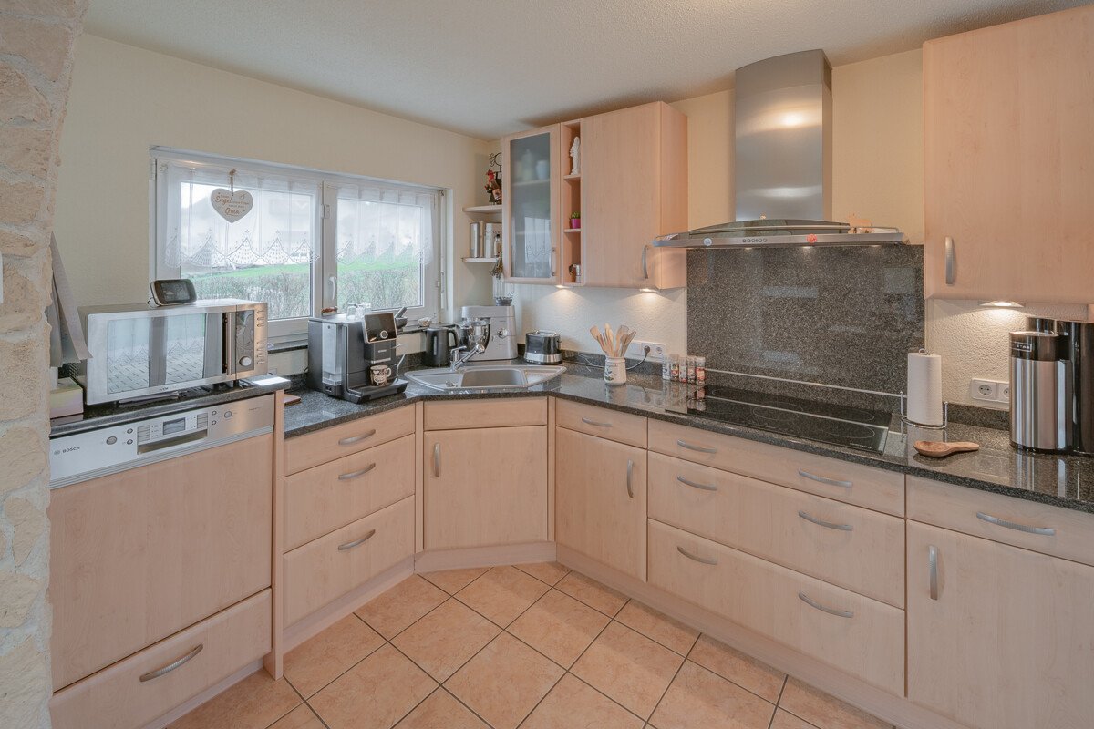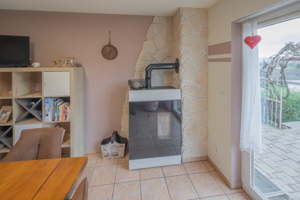 Die offene Küche mit Essbereich wird für die kalten Tage mit einem Pelletsofen, derf eine wohnliche gemütliche Atmosphäre erzeugt, komplettiert.