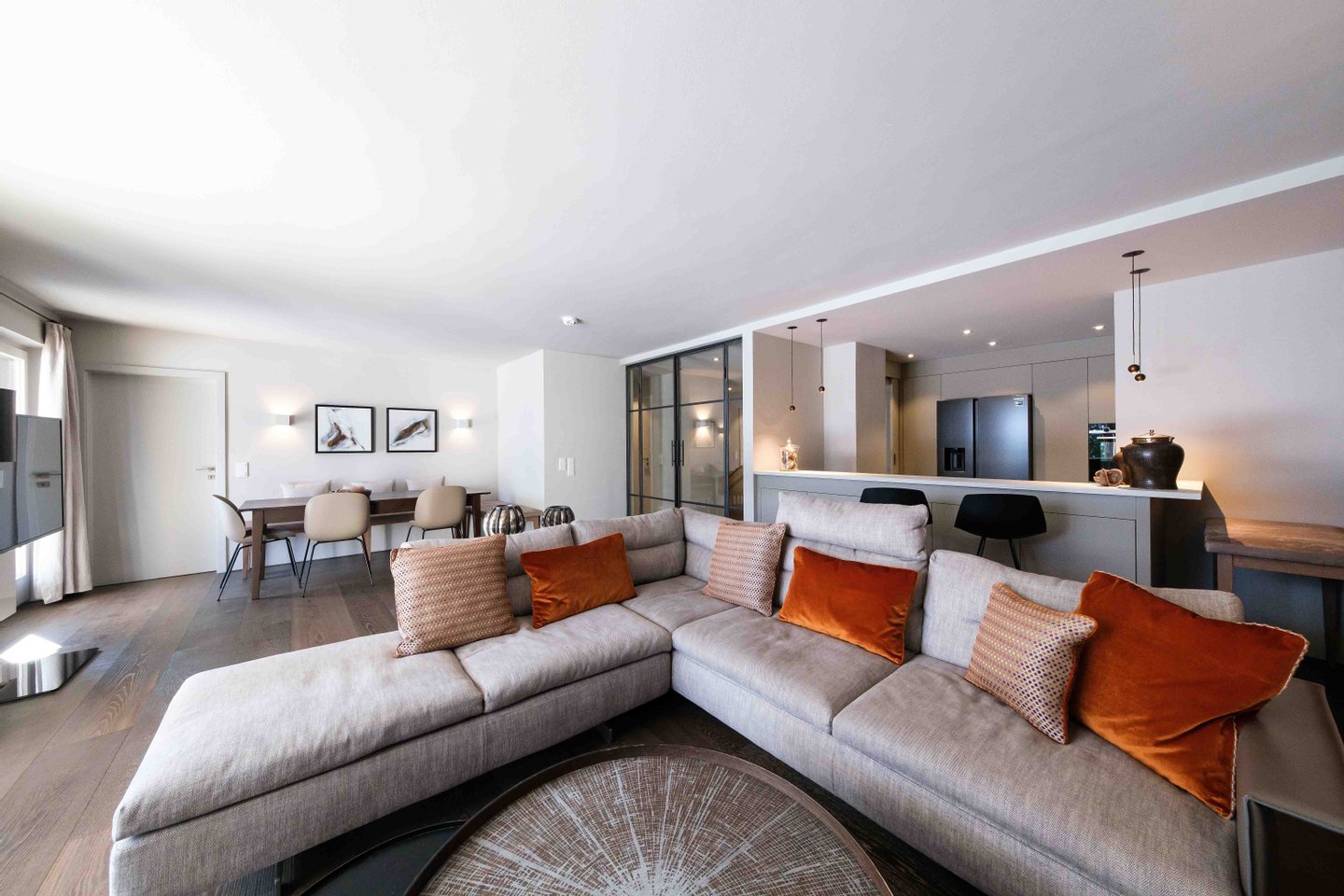 Das ausgewählte Interieur zeigt einen zeitlos eleganten Stil mit alpinen Akzenten und verspricht ein Wohlfühlambiente. Die Planung und Umsetzung erfolgte mit viel Liebe zum Detail.