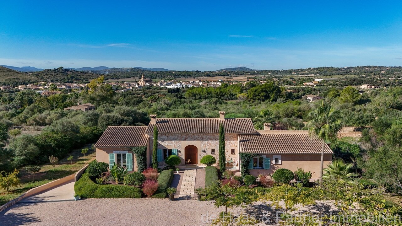Durch eine hohe beeindruckende Holztür betreten Sie die 5m hohe lichtdurchflutete Wohnhalle und werden sofort von einem traumhaften Landschaftsblick auf die Kirche von Son Carrió begrüßt. Das Anwesen liegt auf einem in Süd-West Ausrichtung gelegenem großen Grundstück von 16.156 m².