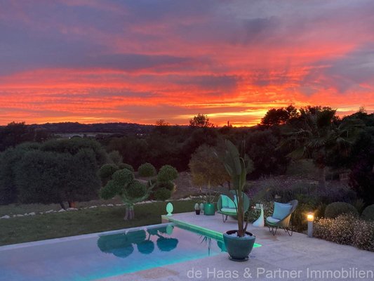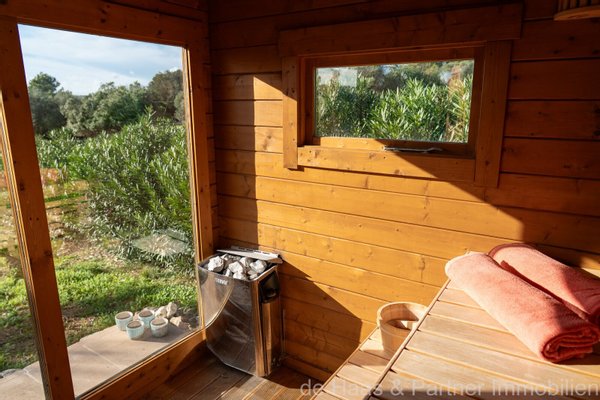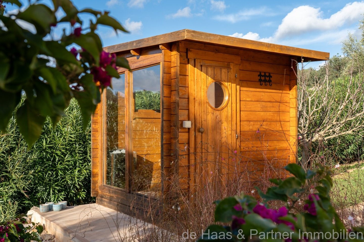 Von der Terrasse führen einige Treppenstufen zum 40 m² großen beheizbaren Salzwasser-Infinity Pool. Auch hier gibt es weitere Sonnenterrassen von ca. 100 m². Als Highlight ist im Garten eine Holzsauna mit Panoramafenster, die zum Entspannen einlädt. Des Weiteren befindet sich auf dem komplett eingezäunten Grundstück ein großer Stall mit Wasser und Strom, der als Gerätehaus, Stall oder eventuell als weiteres Gästehaus genutzt werden kann.