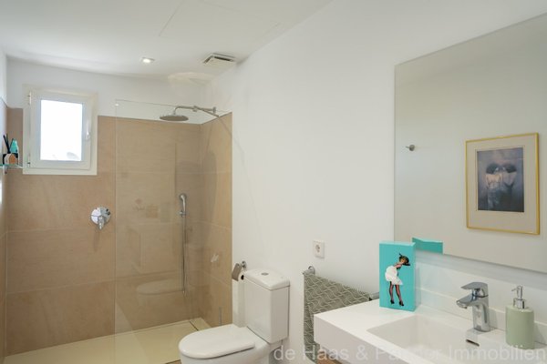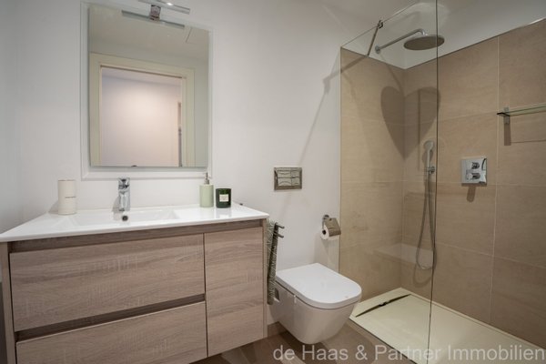 Hinter der Küche befindet sich das großzügige Gästebad, das ebenfalls mit Dusche ausgestattet ist. Angrenzend liegt ein großer Hauswirtschaftsraum mit eigenem Zugang von außen, der auch als weiteres Schlafzimmer oder Büro genutzt werden kann.
