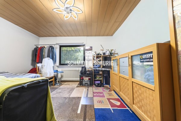 Im Obergeschoss befinden sich vier Zimmer, darunter zwei Schlafzimmer, ein Badezimmer sowie ein zusätzliches Gäste-WC. Die funktionale Raumaufteilung und die vorhandene Einbauküche bieten eine solide Basis für individuelle Gestaltungsmöglichkeiten. Die Einliegerwohnung verfügt über etwa 58 m², aufgeteilt in zwei Zimmer, Küche und Bad, und schafft zusätzlichen Wohn- oder Arbeitsraum.