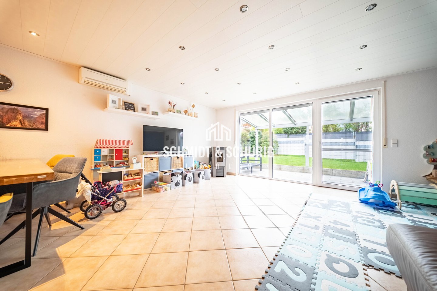 Komfortable Extras wie eine Klimaanlage sorgen auch an heißen Tagen für angenehme Temperaturen. Der Garten mit angrenzender Terrasse bietet einen geschützten Rückzugsort im Freien und zusätzlichen Raum zur Erholung.