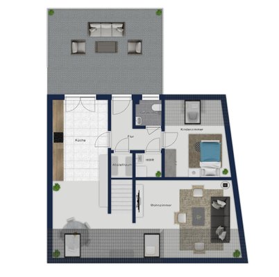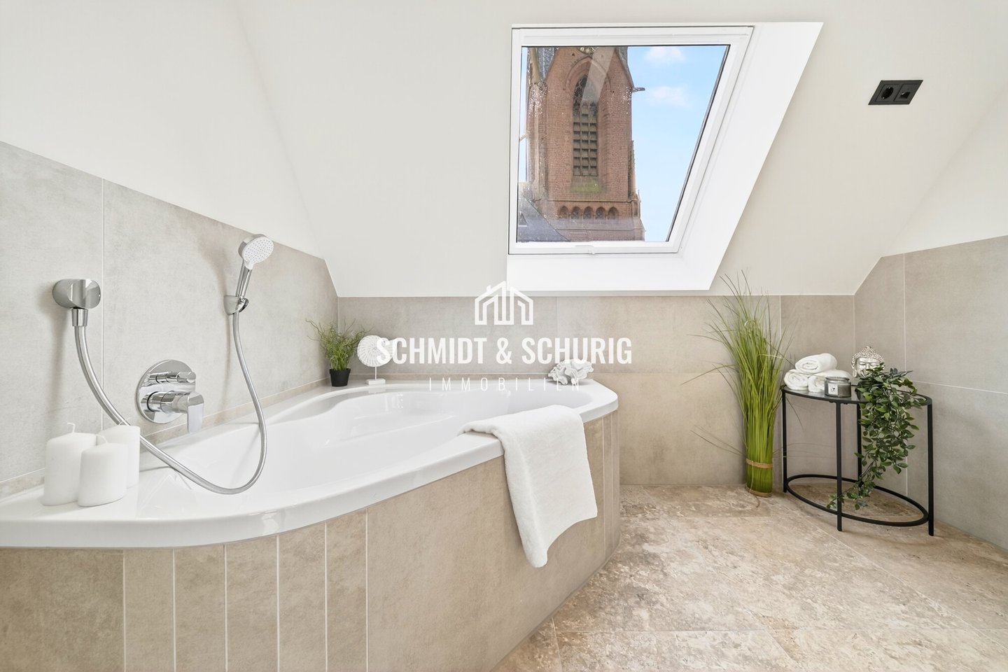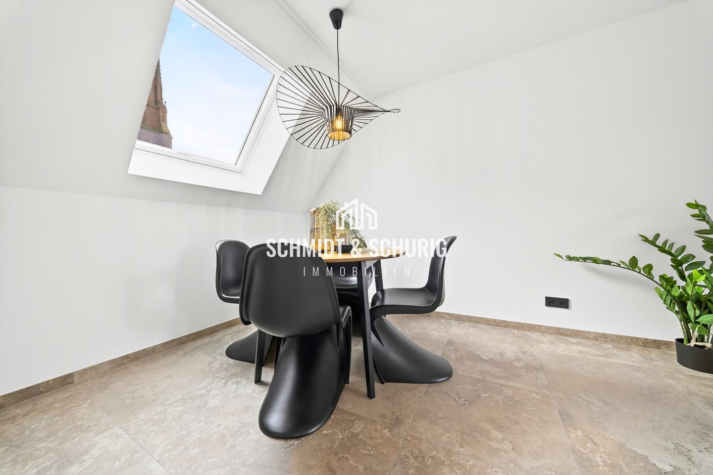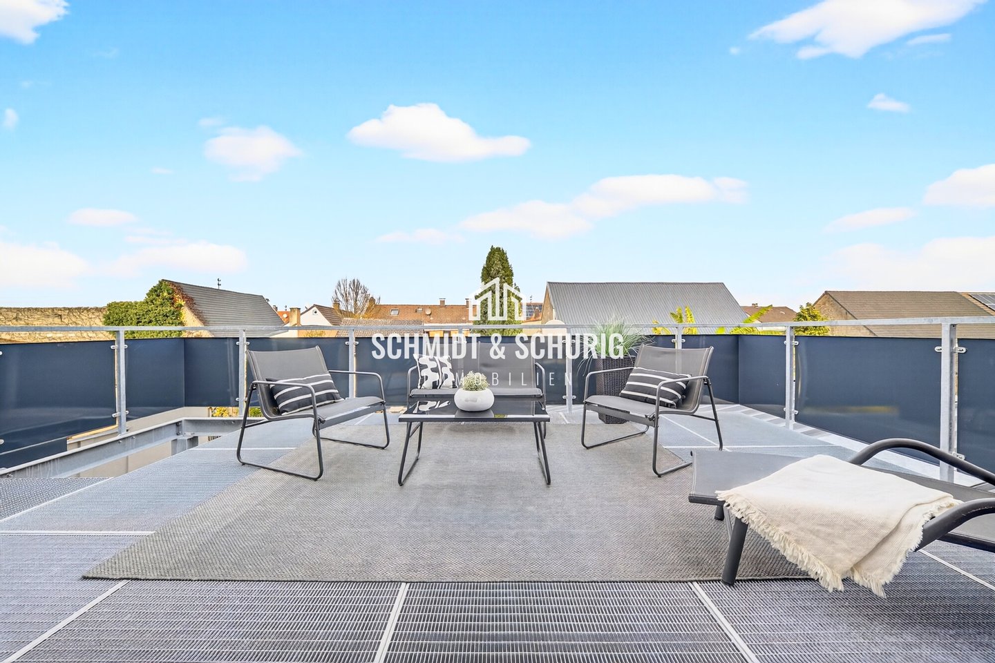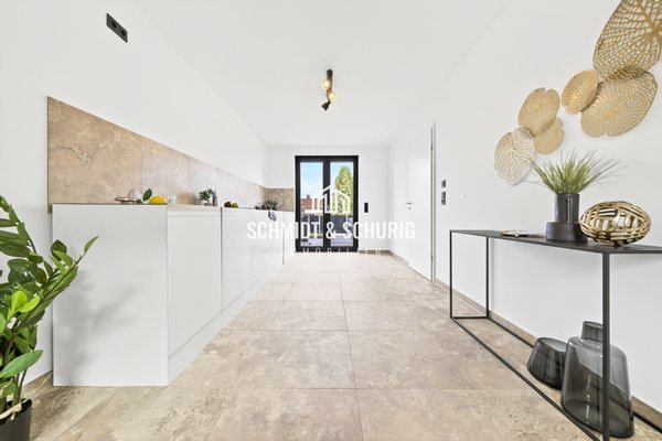 Der offene Küchenbereich bildet das kommunikative Zentrum der Wohnung und bietet direkten Zugang zum ca 25m² großen Balkon mit Wasseranschluss, auf dem sich sonnige Stunden bei einem Gläschen Wein oder die Tasse Kaffee am Morgen genießen lassen.