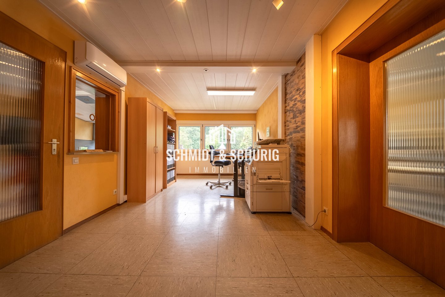 Der Bürokomplex überzeugt durch helle, funktionale Räume und einer durchdachten Raumaufteilung: Neben klassischen Büroräumen stehen ein Kantinenraum, 4 Archivräume, 2 Sanitärräume, sowie ein Serverraum zur Verfügung. Teile des Bürotrakts sind klimatisiert.