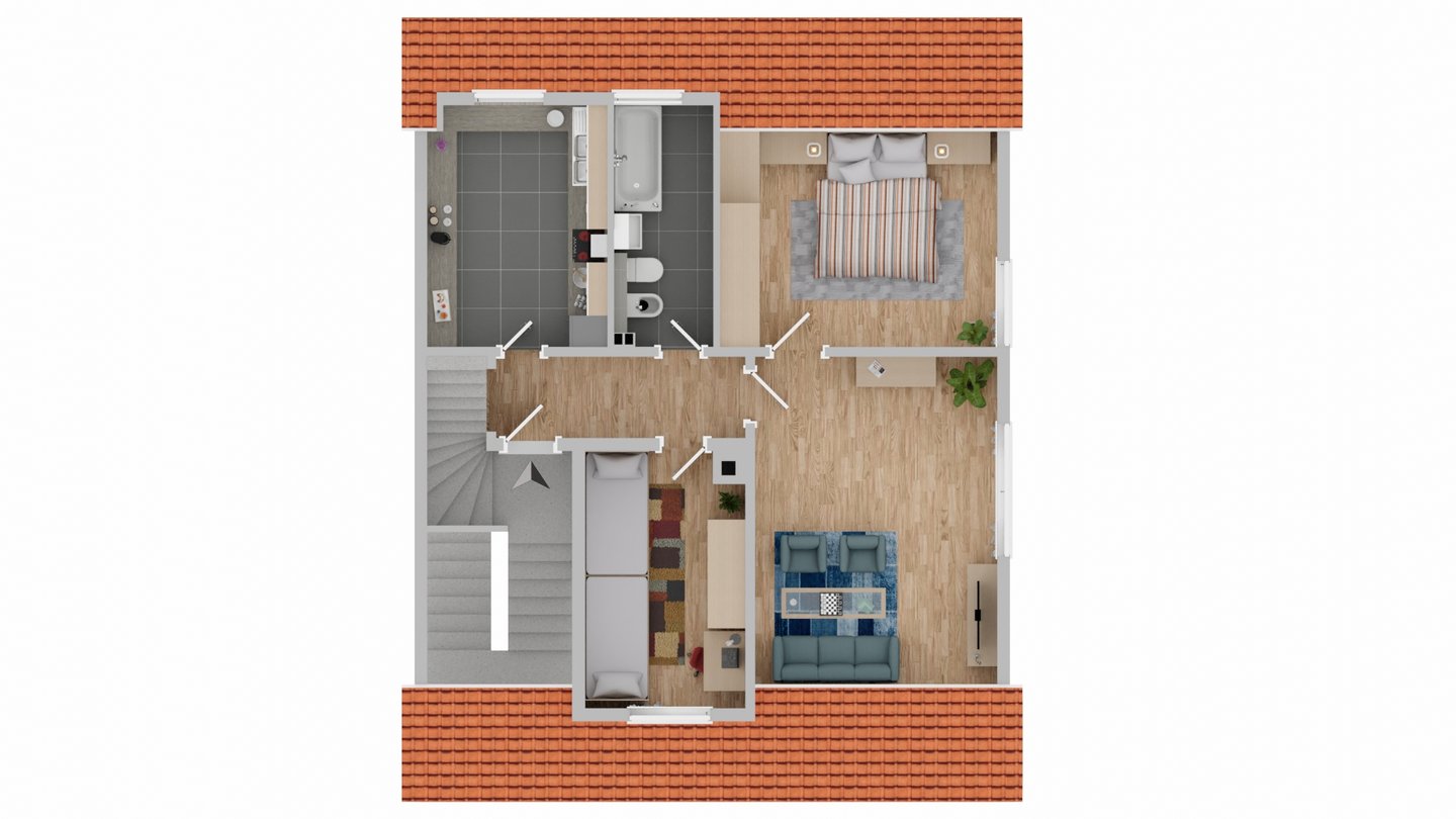 Das Erdgeschoss bildet den lebendigen Mittelpunkt des Hauses. Der großzügige Wohnbereich erstreckt sich über drei Zimmer und wird durch den Balkon harmonisch nach außen erweitert. Lichtdurchflutet und offen gestaltet entsteht hier ein Umfeld, das sowohl den Alltag als auch besondere Anlässe auf ideale Weise begleitet.