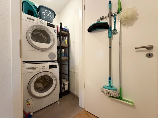 Der Hauswirtschaftsraum konzentriert Waschmaschine, Trockner und Staubsauger etc. an einem Ort. Ein eigener Keller schafft zusätzlichen Stauraum für Koffer, Sportgeräte und Sonstiges, was nicht täglich benötigt werden. Der eigene Stellplatz in der Tiefgarage macht den Weg von der Haustür zum Auto kurz und trocken.