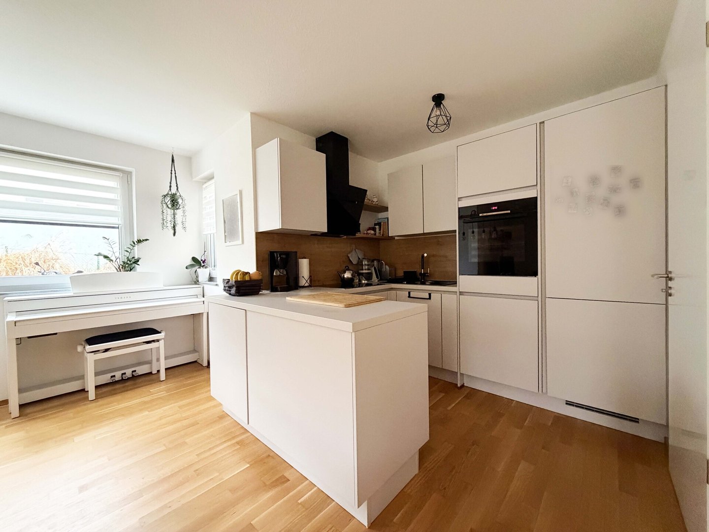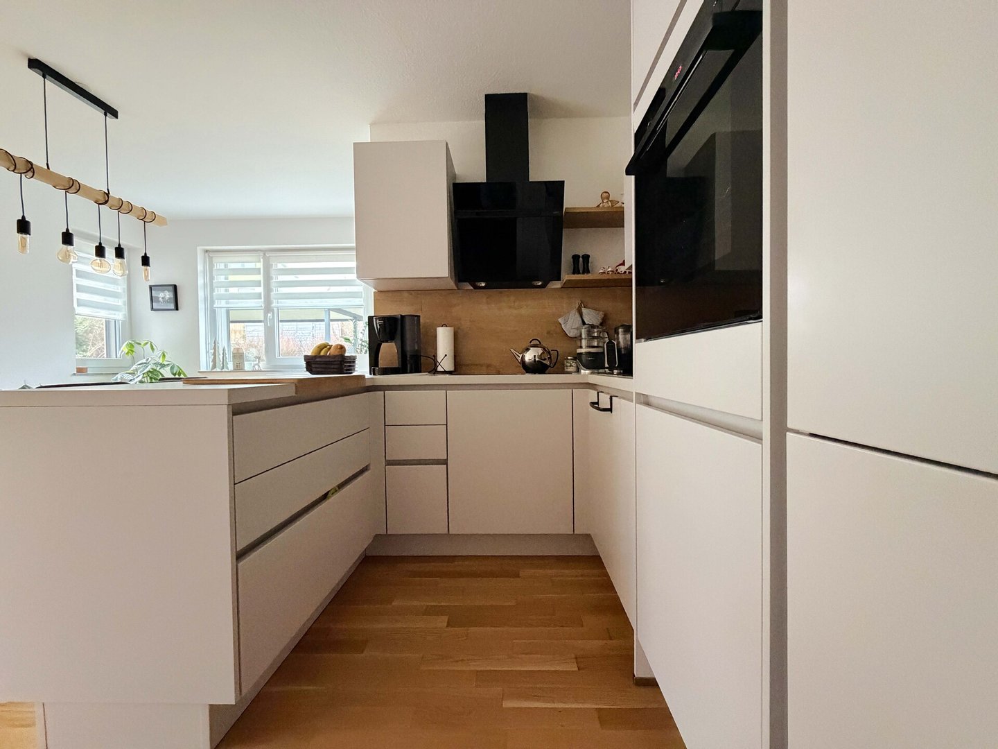 Die Küche liegt unmittelbar neben dem Essbereich. Die Wege sind kurz, die Arbeitsflächen durchdacht. Und während ein Topf leise köchelt, kann man gleichzeitig mit jemandem am Tisch sprechen.