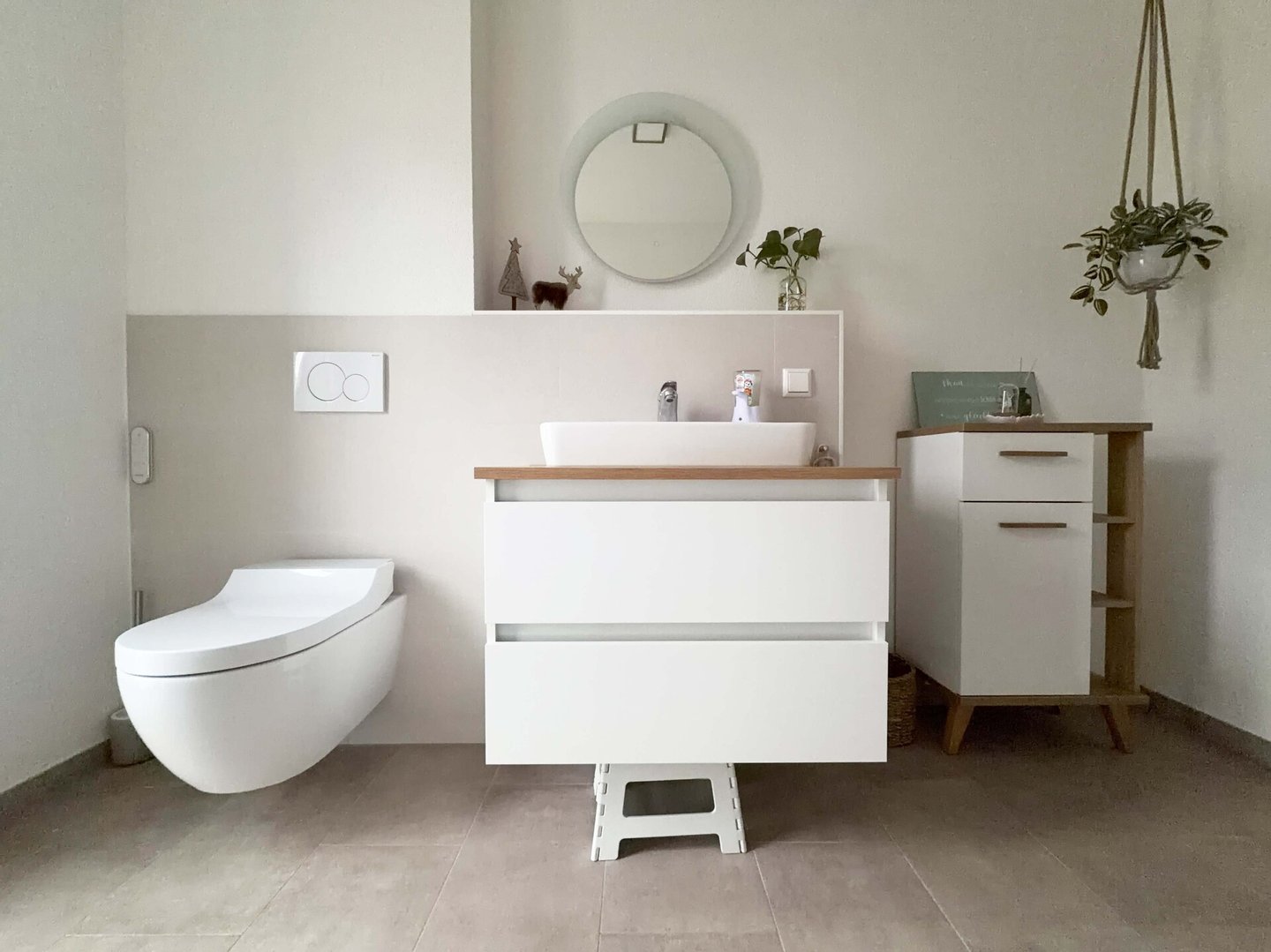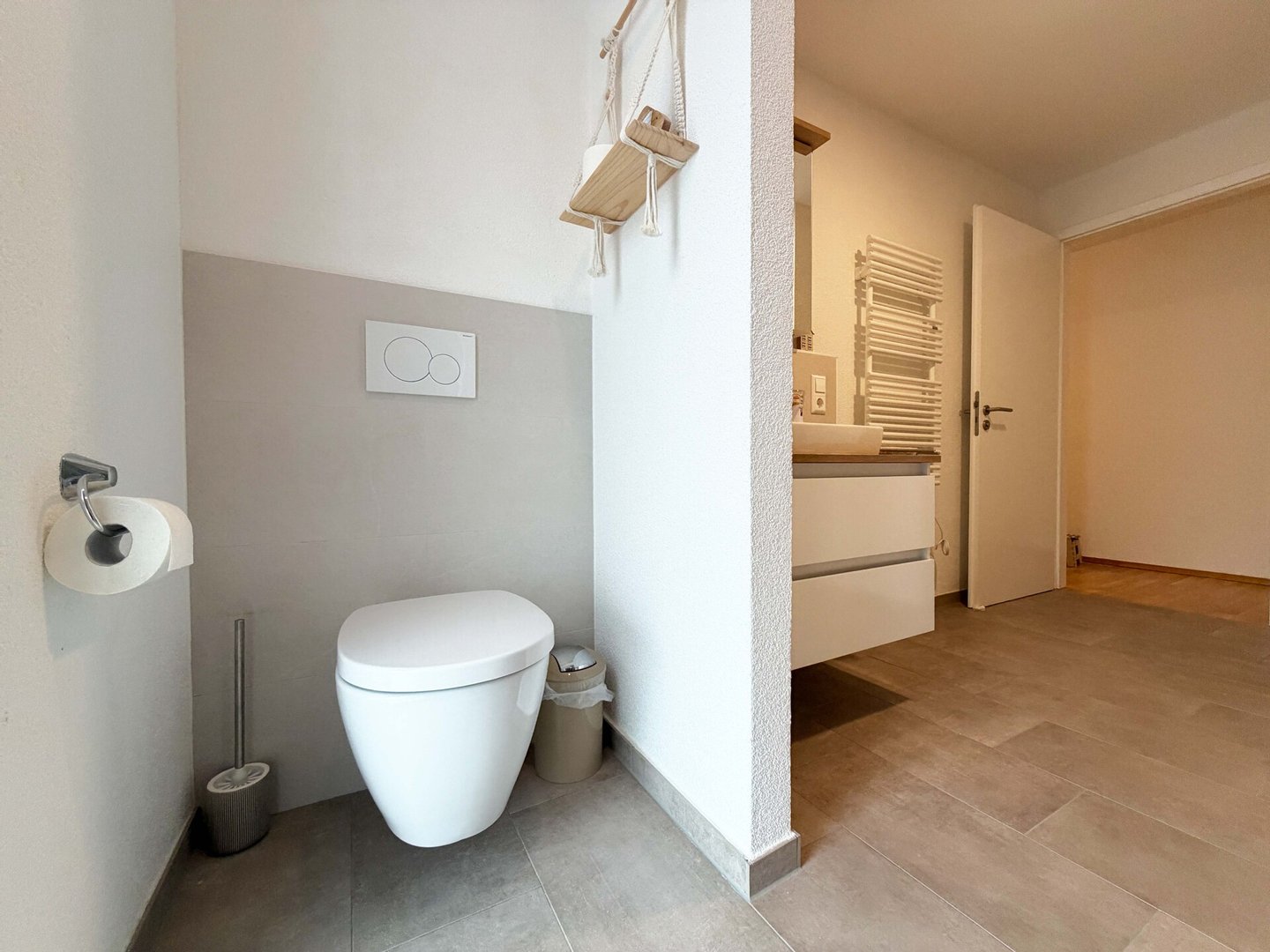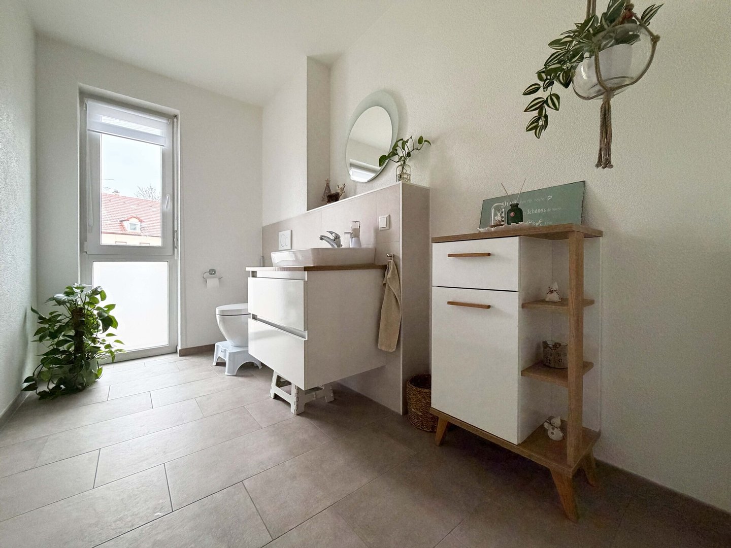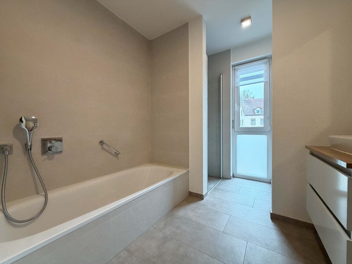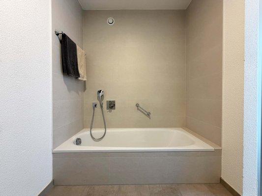 Das Badezimmer unterstützt den Tagesablauf optimal. Die separate Dusche in der Duschkabine erleichtert den Start am frühen Morgen. Die schöne Badewanne bietet Platz für eine längere Pause nach intensiven Tagen. Handtücher, Pflegeprodukte und Wäsche haben hier ihren festen Ort.