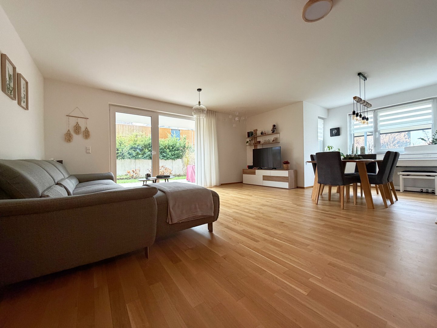 Das Wohn- und Esszimmer ist das Herzstück des Familien-Zuhauses. Auf der linken Seite des mit fast 40 m² beeindruckenden Raumes ist der Bereich für Gemütlichkeit. Endlich haben Sie genug Platz für Ihre Couchlandschaft. Links von der Couch schauen Sie auf Ihre eigene Terrasse. Gegenüber der Couch ist der optimale Platz für Ihren TV- und Mediabereich.