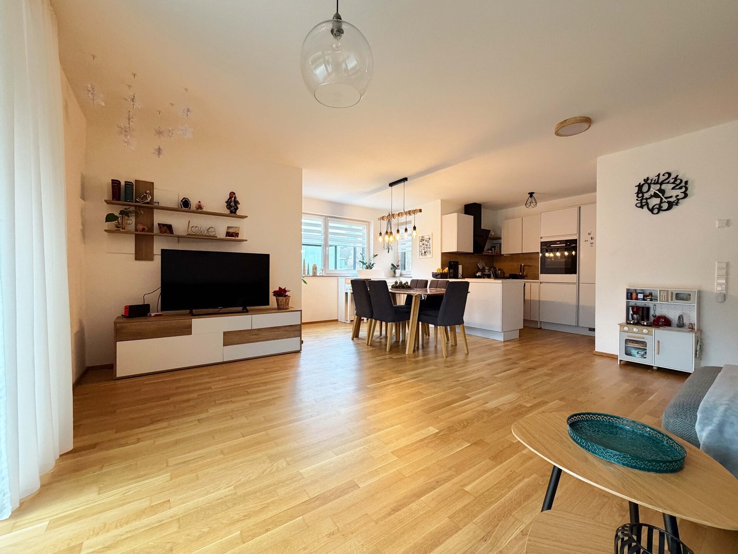Die rechte Seite des Wohn- und Esszimmers ist ideal für eine große Tafel. Hier finden künftig gemeinsame Mahlzeiten mit Ihren Lieben und Gästen statt.