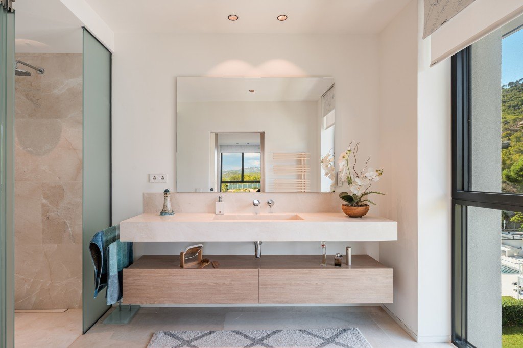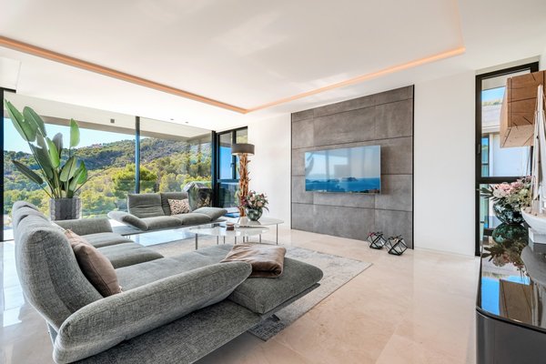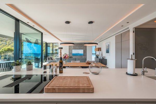Zum Verkauf steht ein großzügiges Penthouse im dritten Obergeschoss mit einer Wohnfläche von 186 Quadratmetern. Beim Betreten befindet sich auf der linken Seite der offene Wohn- und Essbereich mit herrlichem Blick auf die Bucht. Die Designerküche der Marke Poliform ist mit hochwertigen Küchengeräten der Marke Miele ausgestattet und geht nahtlos in den Ess- und Wohnbereich über, der auf eine überdachte Terrasse mit beeindruckendem Meerblick führt. Zusätzlich gibt es einen separaten Hauswirtschaftsraum mit Waschmaschine und Trockner der Marke Miele und extra Stauraum für mehr Komfort.