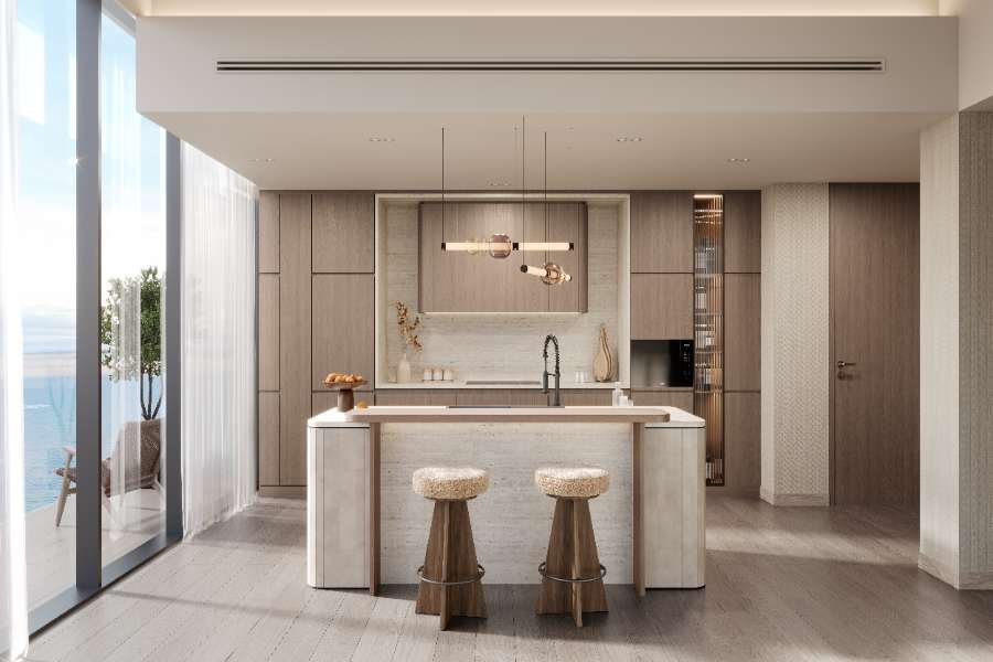 Die Wohnungen selbst verfügen über geräumige Grundrisse mit großen Balkonen oder Terrassen, separaten Küchen und Panoramafenstern, die einen herrlichen Blick auf den Strand und die Gärten bieten. Die eleganten Oberflächen und das moderne Design schaffen einen komfortablen und stilvollen Lebensraum, den Sie genießen können.