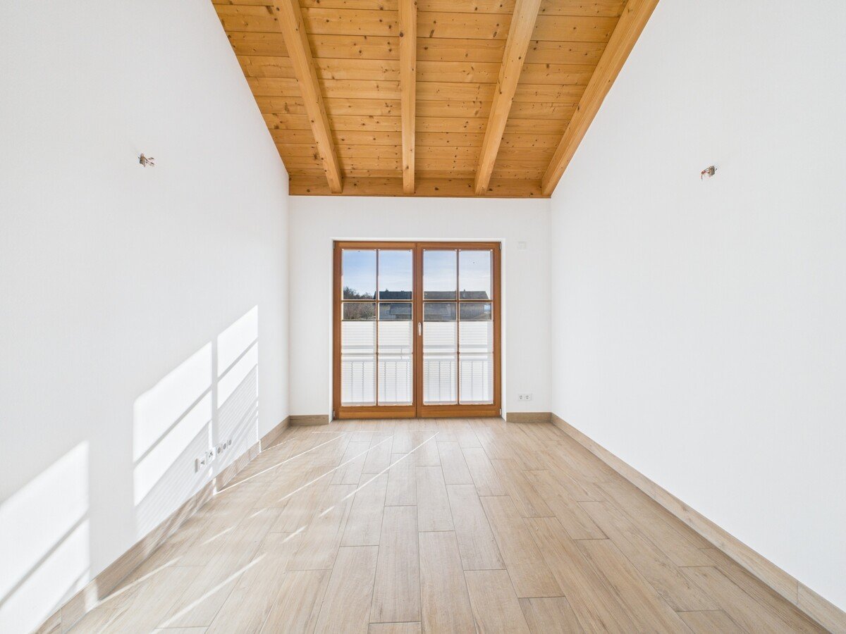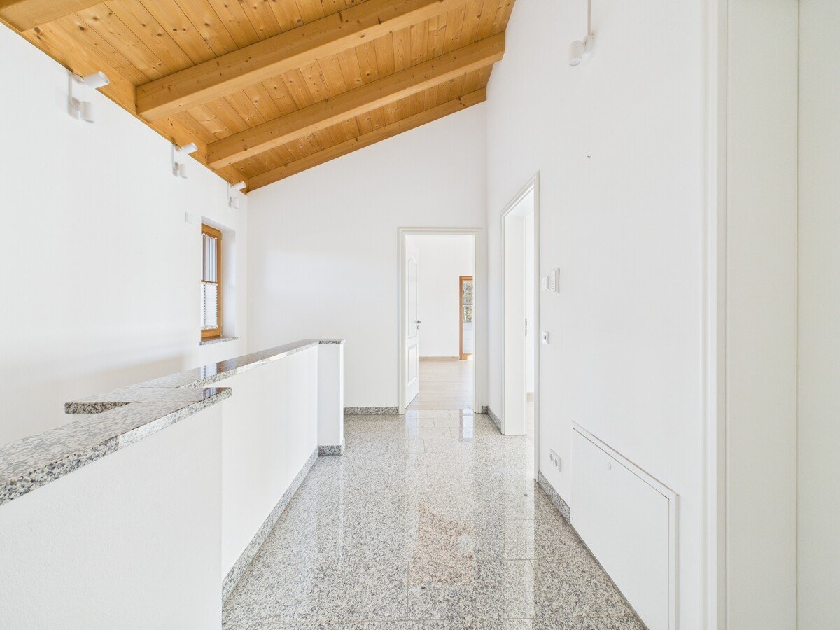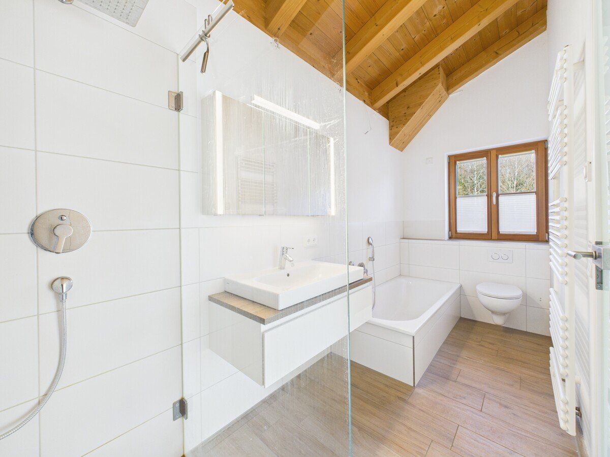 Im Obergeschoss befindet sich der private Rückzugsbereich mit einem beeindruckenden Ausblick auf die Alpenkette. Der Masterbereich umfasst ein Elternschlafzimmer mit Balkonzugang und ein luxuriöses Masterbad. Zwei weitere Kinderzimmer und ein zusätzliches Bad bieten ausreichend Platz und Komfort. Alle Bäder sind modern und geschmackvoll ausgestattet. Hochwertige Fliesen in Holzoptik ziehen sich durch die Wohnräume, während elegante Fliesen in Diele und Treppenbereich für ein stilvolles Ambiente sorgen.
