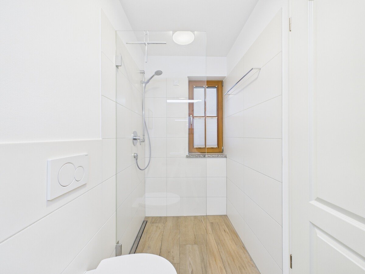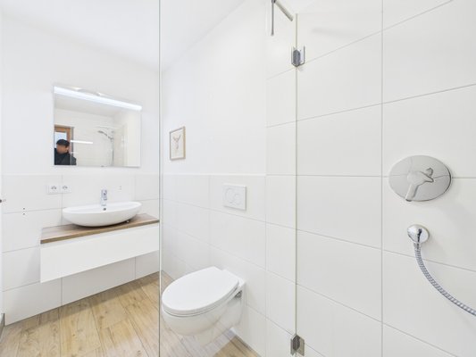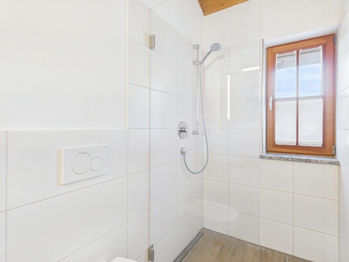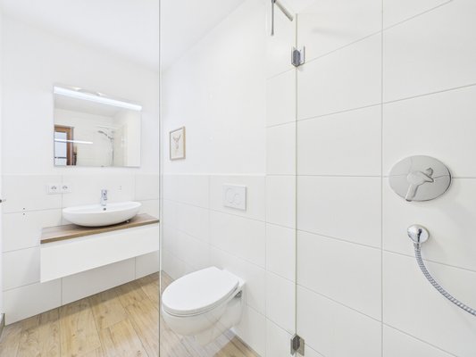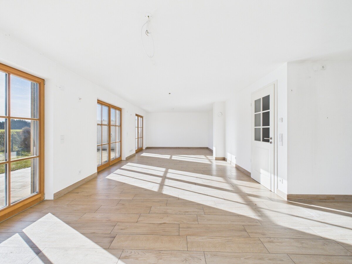 Im Obergeschoss befindet sich der private Rückzugsbereich mit einem beeindruckenden Ausblick auf die Alpenkette. Der Masterbereich umfasst ein Elternschlafzimmer mit Balkonzugang und ein luxuriöses Masterbad. Zwei weitere Kinderzimmer und ein zusätzliches Bad bieten ausreichend Platz und Komfort. Alle Bäder sind modern und geschmackvoll ausgestattet. Hochwertige Fliesen in Holzoptik ziehen sich durch die Wohnräume, während elegante Fliesen in Diele und Treppenbereich für ein stilvolles Ambiente sorgen.