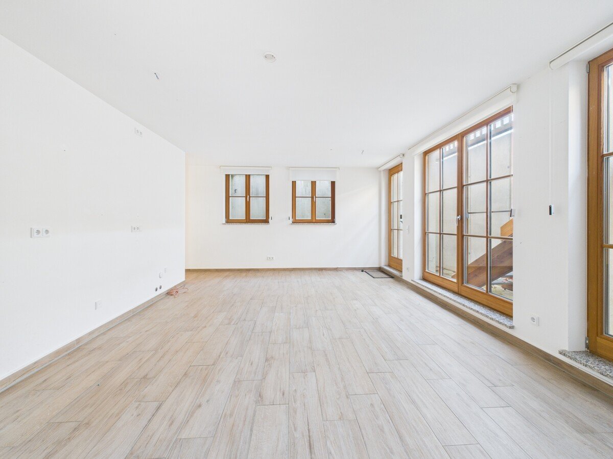 Die bodentiefen Fenster sorgen für sehr viel Helligkeit, der Sichtdachstuhl im Obergeschoss für ein ganz besonderes Raumgefühl.