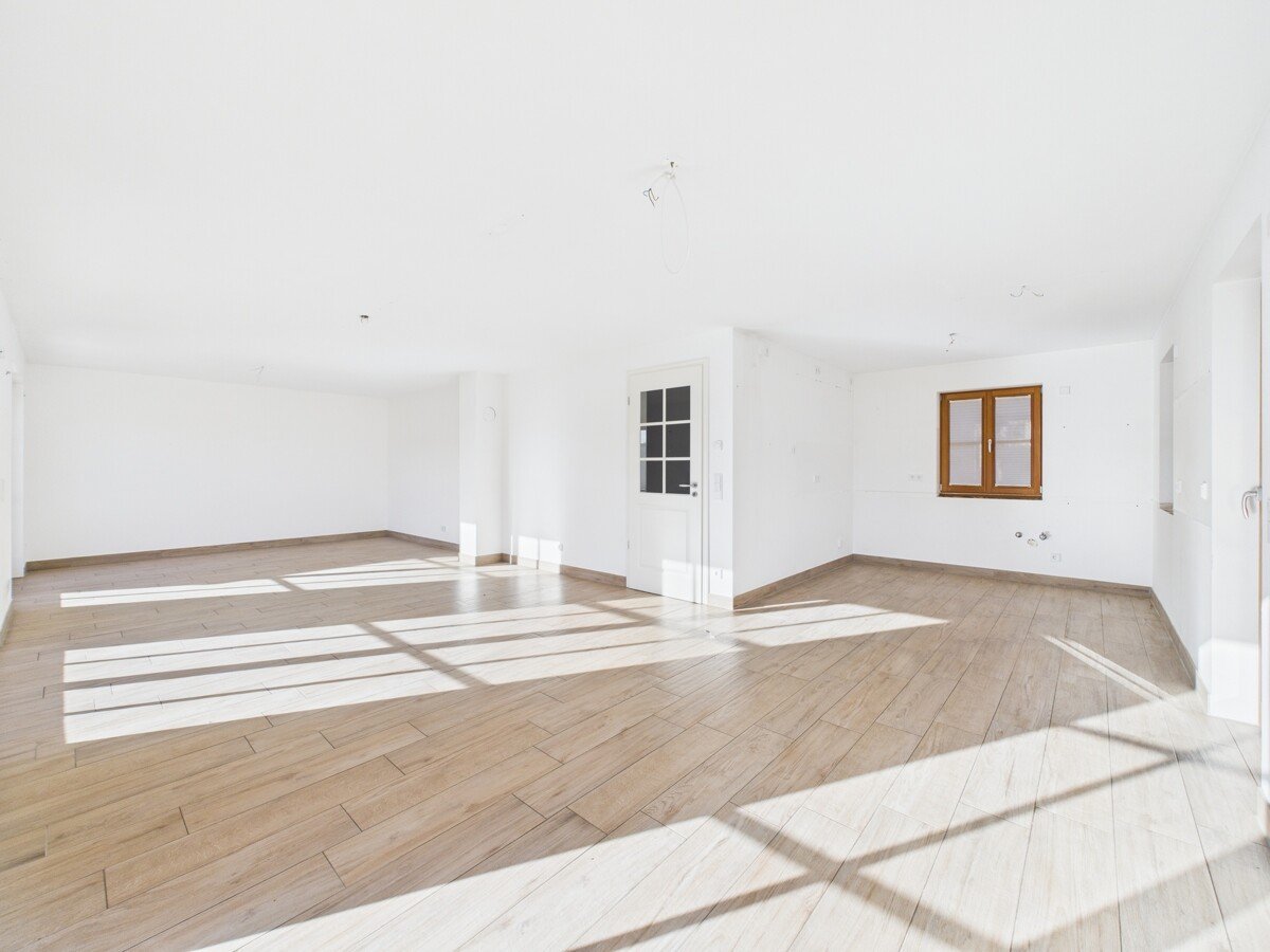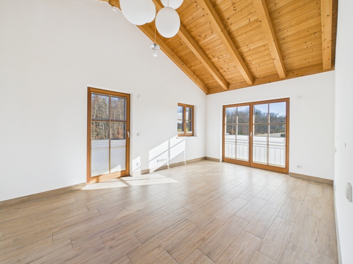 Die bodentiefen Fenster sorgen für sehr viel Helligkeit, der Sichtdachstuhl im Obergeschoss für ein ganz besonderes Raumgefühl.
