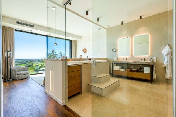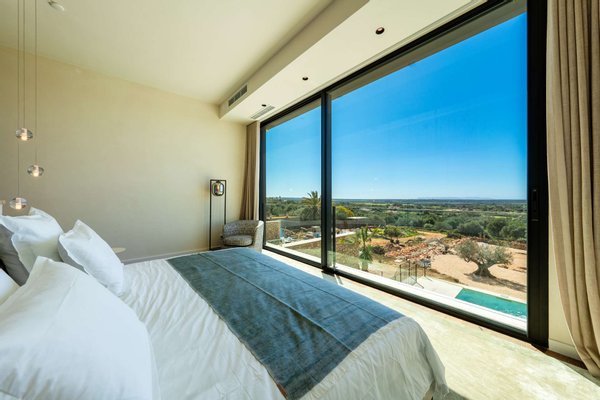 Herausstehend ist die elegant erhöht integrierte Badewanne, von der aus eine spektakuläre Sicht auf die Insel Cabrera gegeben ist. Zwei weitere Schlafzimmer sowie ein zusätzliches Badezimmer bieten ausreichend Platz für Familie oder Gäste. Ein besonderes Highlight ist die rund 70 m² große Dachterrasse mit beeindruckendem Fernblick – bis nach Palma.