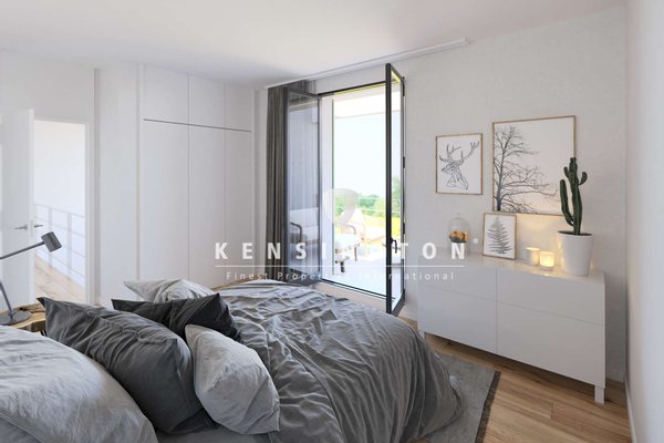 Im ersten Stock, der über eine Galerie zum Wohnbereich nach unten geöffnet ist, gibt es neben einem großzügigen Vorraum 3 Schlafzimmer, eines davon als Master mit Balkon zum Garten und Bad en-Suite konzipiert.