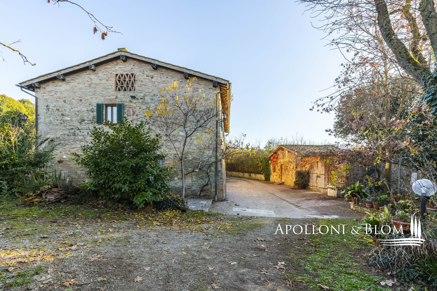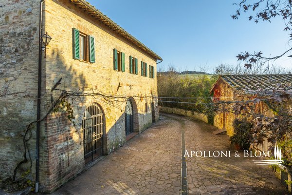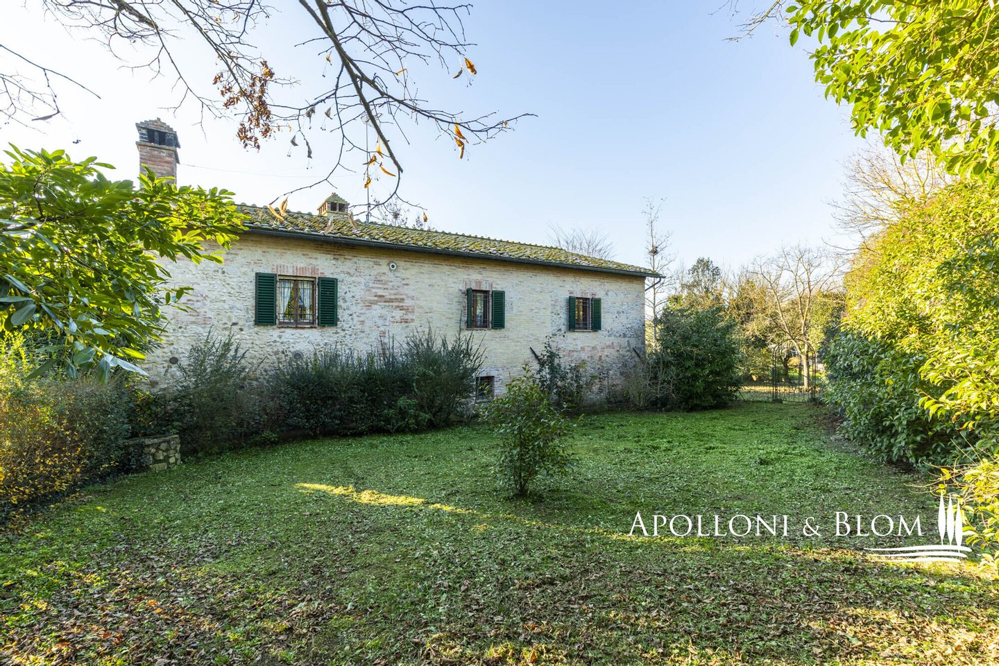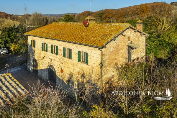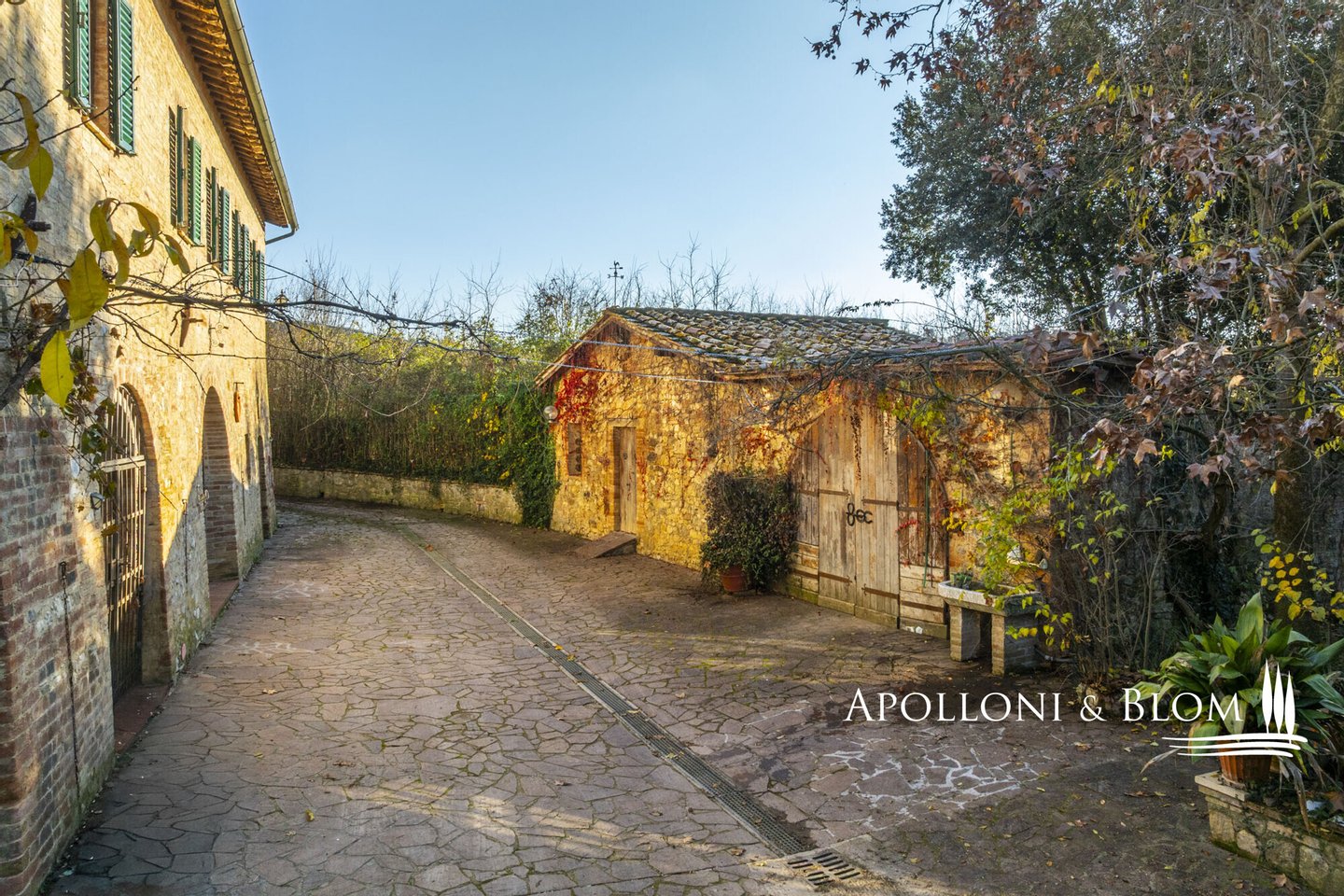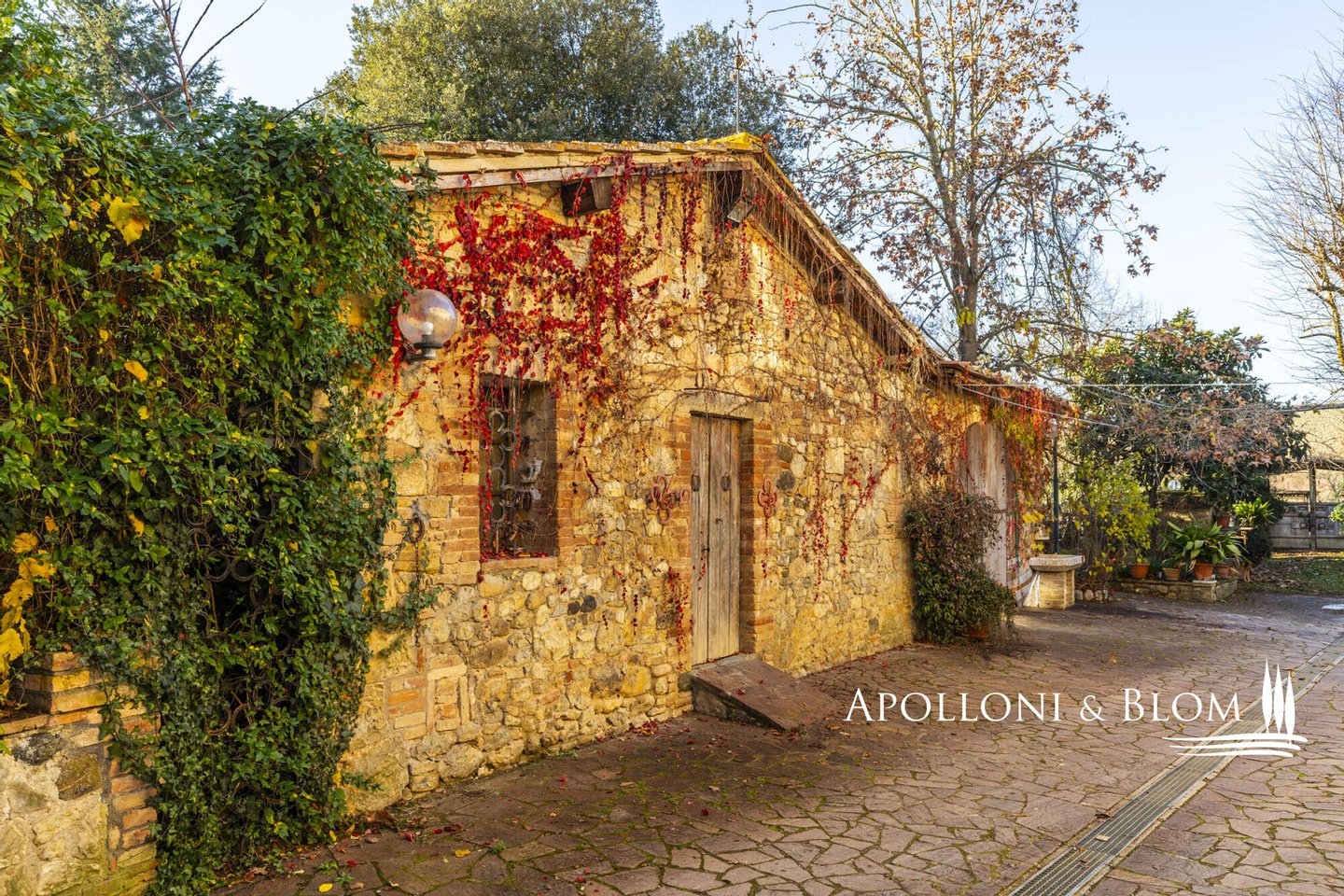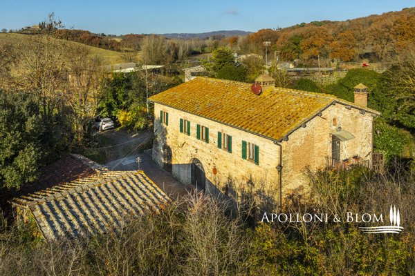 Für Pferdeliebhaber, ein zweistöckiges Landhaus mit Nebengebäuden, zum exklusiven Verkauf auf einem Bauernhof mit Reitställen, in Siena. Nur 5 Kilometer von den Toren der Stadt Siena entfernt, befindet sich diese ehemalige Mühle aus dem 19. Jahrhundert in strategischer Lage auf einem traditionellen toskanischen Bauernhof und bietet direkten Zugang zu einer professionellen Reitschule. Das Haus hat eine Fläche von ca. 337 Quadratmetern auf zwei Etagen und ist von einem 0,38 Hektar großen, eingezäunten Grundstück mit automatischem Tor umgeben, das eine private und sichere Umgebung schafft. Die Innenräume sind warm und stimmungsvoll und zeichnen sich durch Terrakottaböden, eindrucksvolle Gewölbedecken aus Ziegeln, sichtbare Balken und große Bögen aus. Im Erdgeschoss befindet sich ein charmantes, offenes Wohnzimmer mit Kamin, Essbereich und Küche, während im Obergeschoss ein Wohnzimmer mit Kamin, eine zweite Küche mit Essbereich, ein Arbeitszimmer, zwei Schlafzimmer und zwei Bäder untergebracht sind. Das Haus ist in einem guten Zustand und wird teilweise möbliert verkauft, so dass noch Raum für individuelle Gestaltung bleibt. Zwei Nebengebäude, eine Scheune und ein kleineres Nebengebäude, ergänzen den Hauptwohnsitz und bieten weiteres Potenzial, entweder als Lagerraum oder als Platz für ein Studio oder zukünftige Verbesserungen.