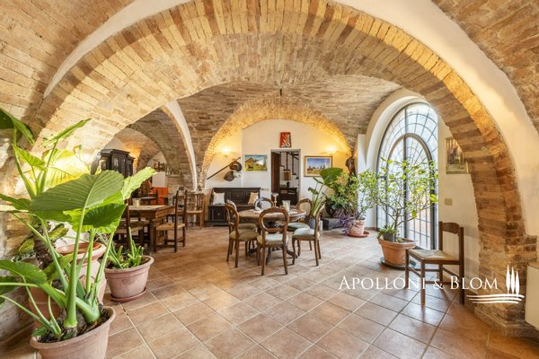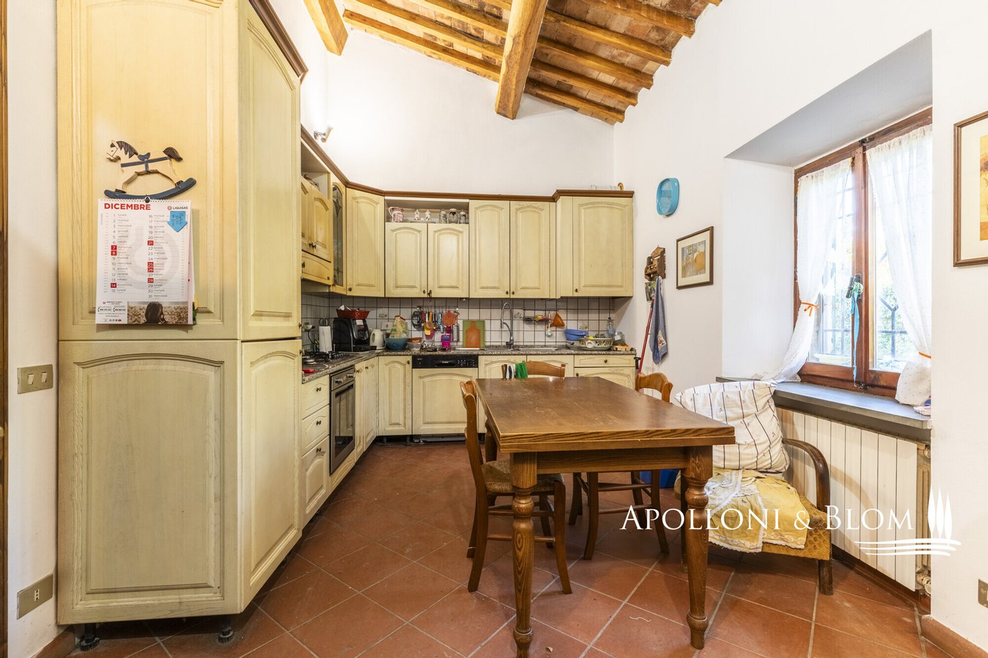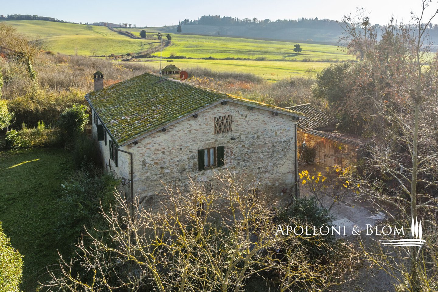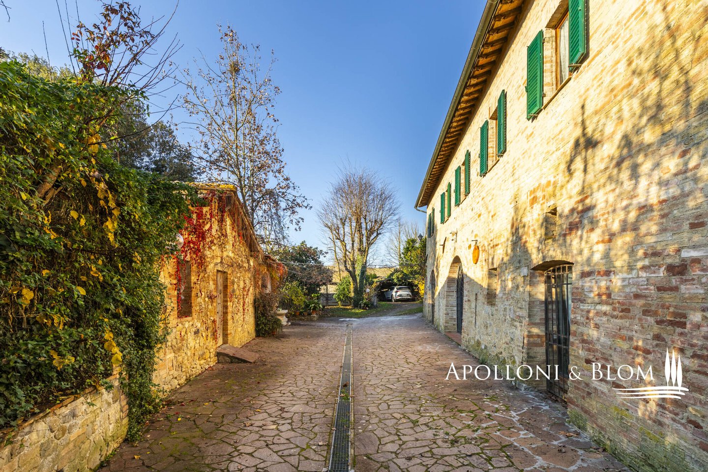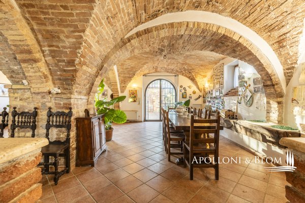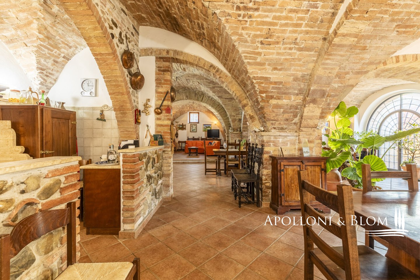 Für Pferdeliebhaber, ein zweistöckiges Landhaus mit Nebengebäuden, zum exklusiven Verkauf auf einem Bauernhof mit Reitställen, in Siena. Nur 5 Kilometer von den Toren der Stadt Siena entfernt, befindet sich diese ehemalige Mühle aus dem 19. Jahrhundert in strategischer Lage auf einem traditionellen toskanischen Bauernhof und bietet direkten Zugang zu einer professionellen Reitschule. Das Haus hat eine Fläche von ca. 337 Quadratmetern auf zwei Etagen und ist von einem 0,38 Hektar großen, eingezäunten Grundstück mit automatischem Tor umgeben, das eine private und sichere Umgebung schafft. Die Innenräume sind warm und stimmungsvoll und zeichnen sich durch Terrakottaböden, eindrucksvolle Gewölbedecken aus Ziegeln, sichtbare Balken und große Bögen aus. Im Erdgeschoss befindet sich ein charmantes, offenes Wohnzimmer mit Kamin, Essbereich und Küche, während im Obergeschoss ein Wohnzimmer mit Kamin, eine zweite Küche mit Essbereich, ein Arbeitszimmer, zwei Schlafzimmer und zwei Bäder untergebracht sind. Das Haus ist in einem guten Zustand und wird teilweise möbliert verkauft, so dass noch Raum für individuelle Gestaltung bleibt. Zwei Nebengebäude, eine Scheune und ein kleineres Nebengebäude, ergänzen den Hauptwohnsitz und bieten weiteres Potenzial, entweder als Lagerraum oder als Platz für ein Studio oder zukünftige Verbesserungen.