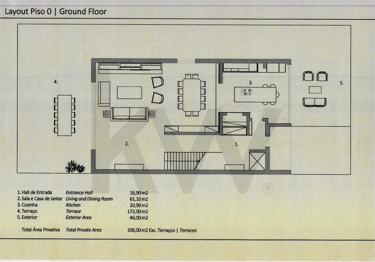 • Erdgeschoss (0): Der wichtigste soziale Bereich des Hauses, der auf Komfort und Unterhaltung ausgelegt ist. Umgeben von weitläufigen Terrassen bietet es den perfekten Rahmen für die Gestaltung verschiedener Wohn- und Essbereiche im Freien.