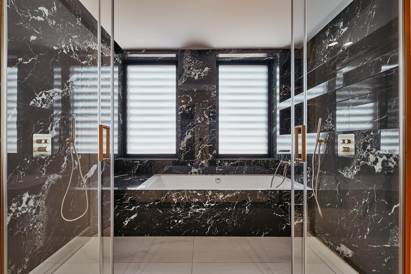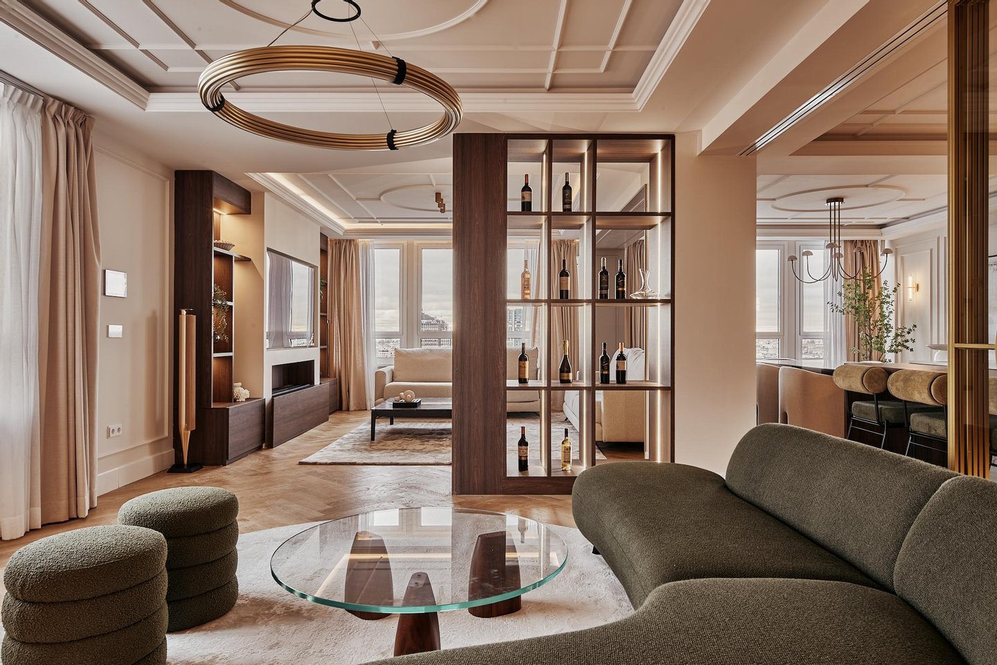 The comprehensive refurbishment has been carried out under contemporary luxury criteria, combining noble materials, custom-made carpentry and a careful interior design. The main space is articulated around a large high-rise living-dining room, conceived as the social core of the house and visually connected to the city in all directions. The main living room incorporates an integrated fireplace, which reinforces the feeling of home and brings warmth and character to the social area, even in an urban high-rise residence.