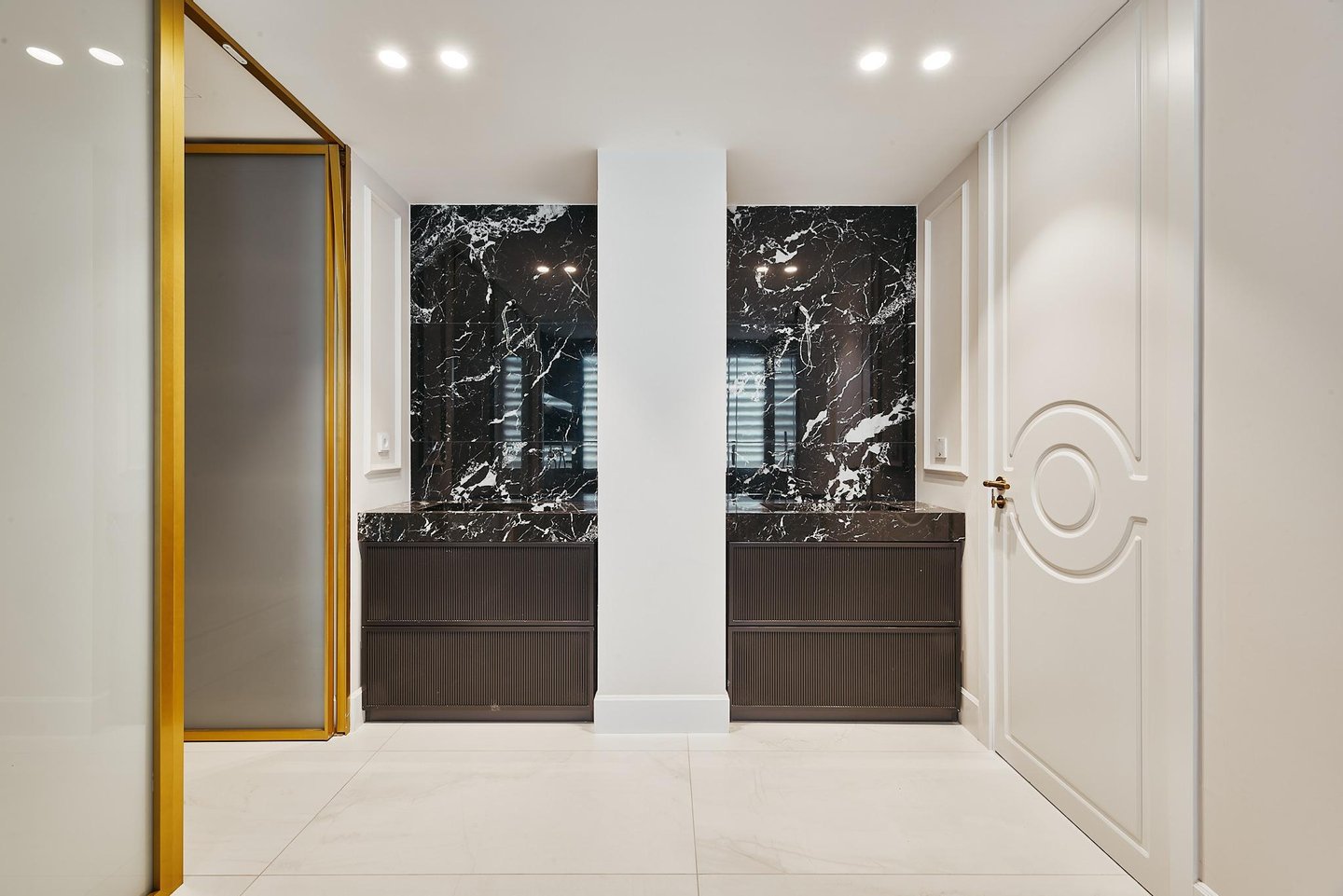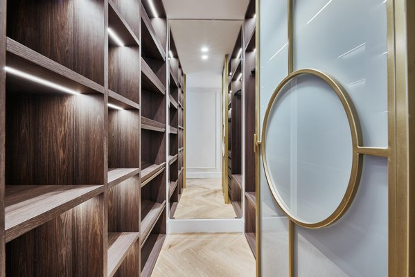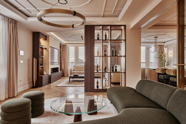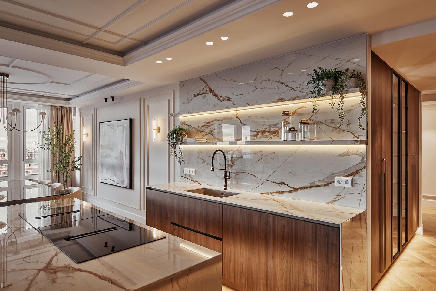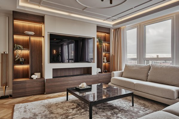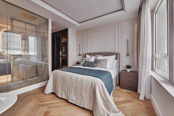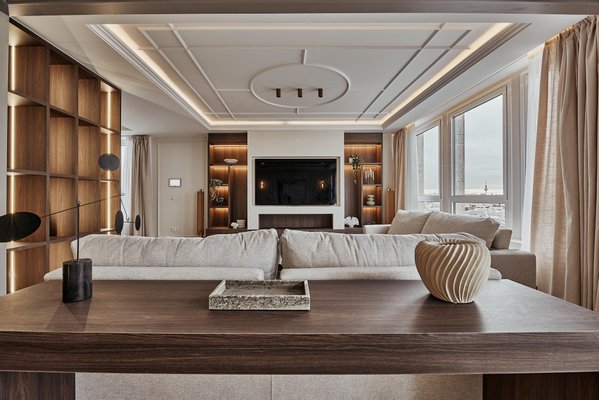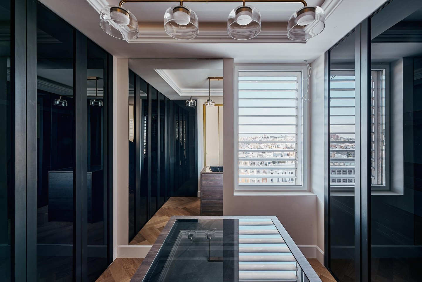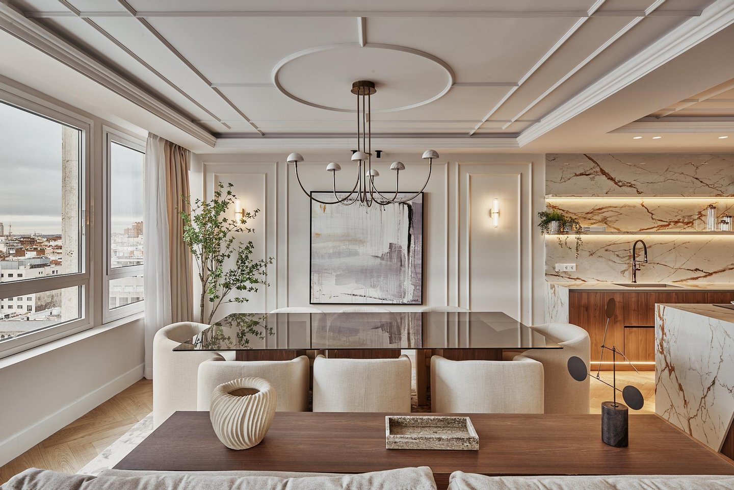 The comprehensive refurbishment has been carried out under contemporary luxury criteria, combining noble materials, custom-made carpentry and a careful interior design. The main space is articulated around a large high-rise living-dining room, conceived as the social core of the house and visually connected to the city in all directions. The main living room incorporates an integrated fireplace, which reinforces the feeling of home and brings warmth and character to the social area, even in an urban high-rise residence.