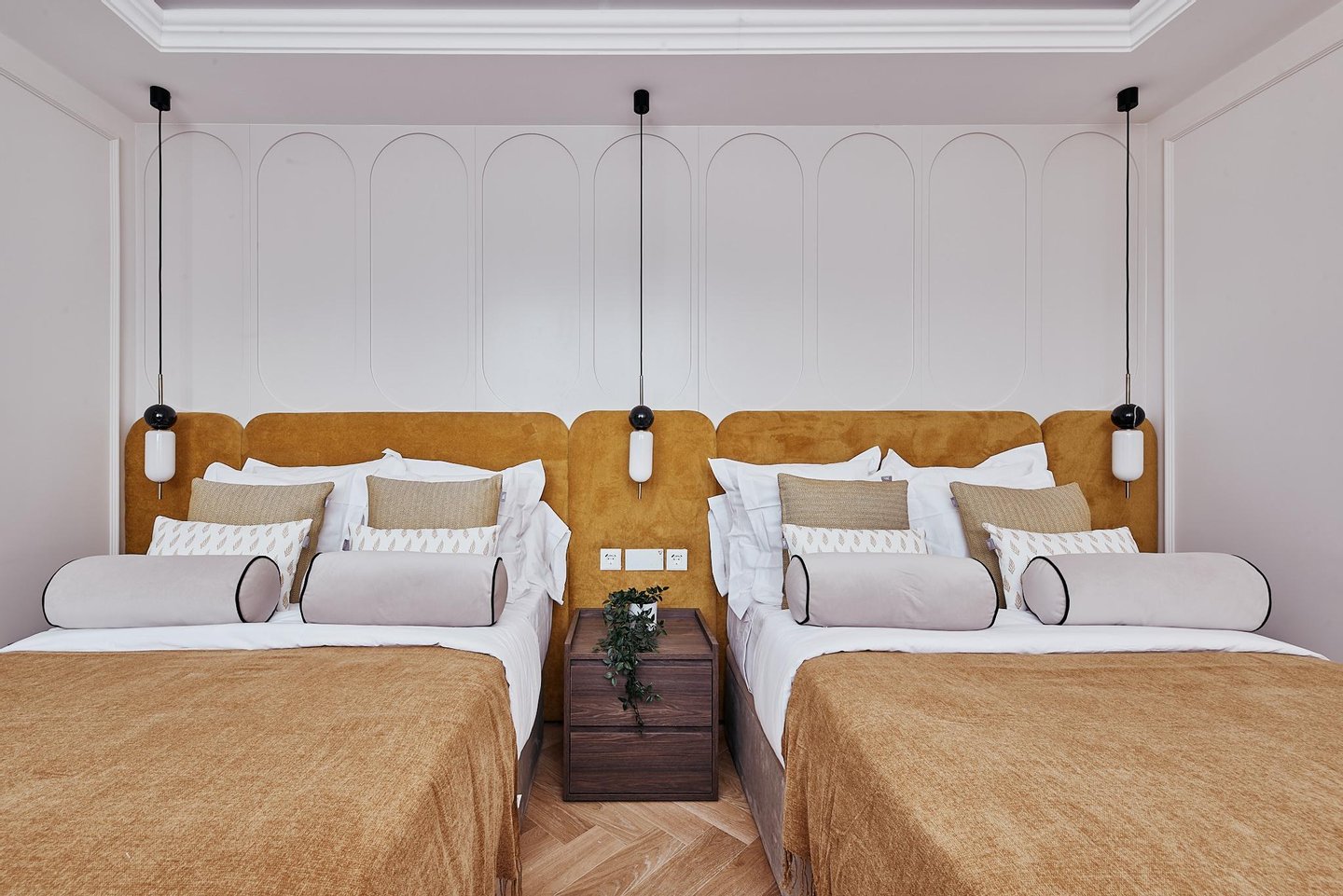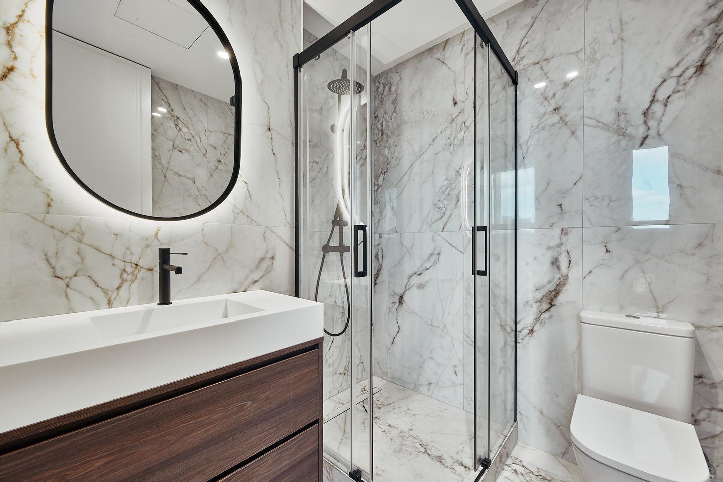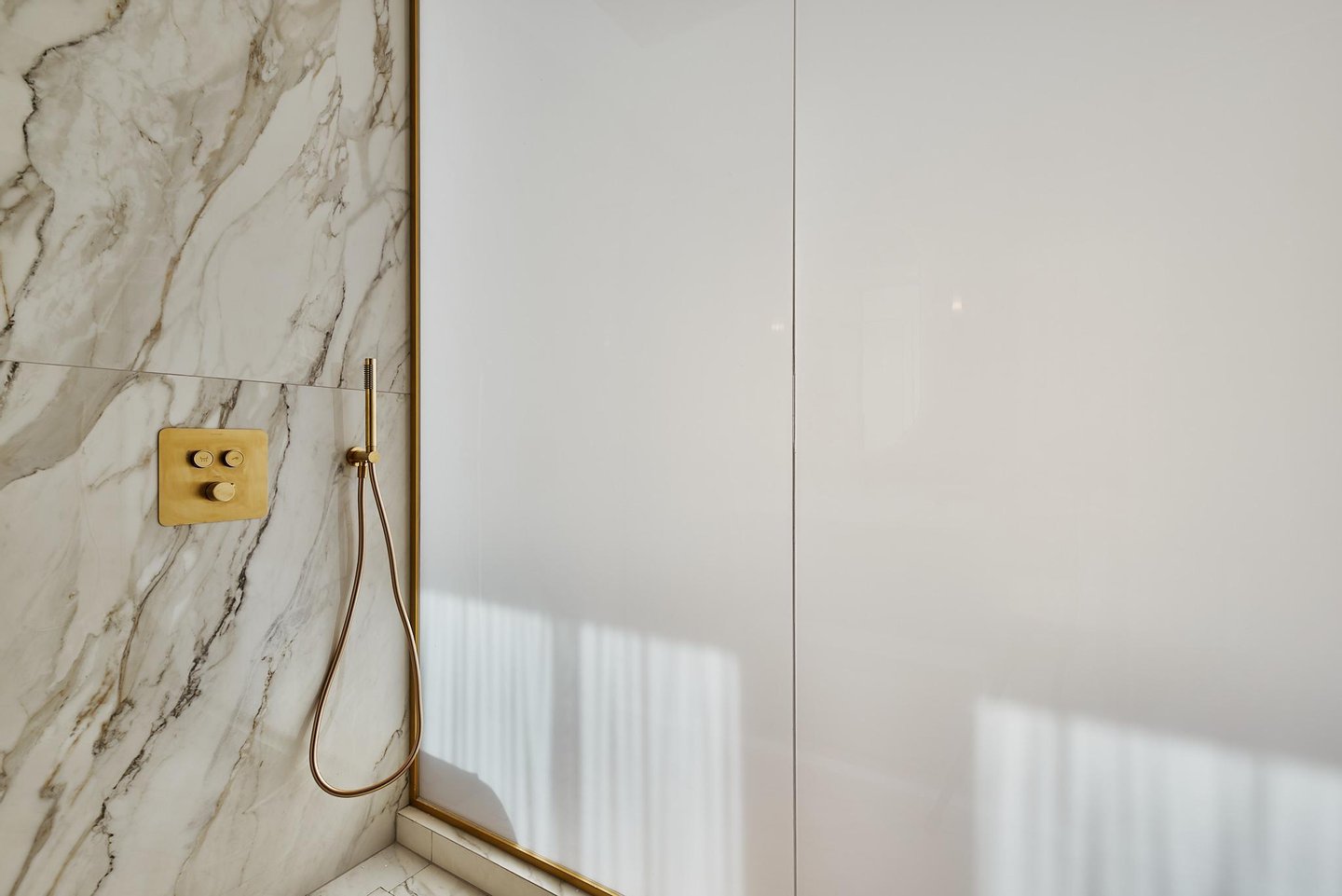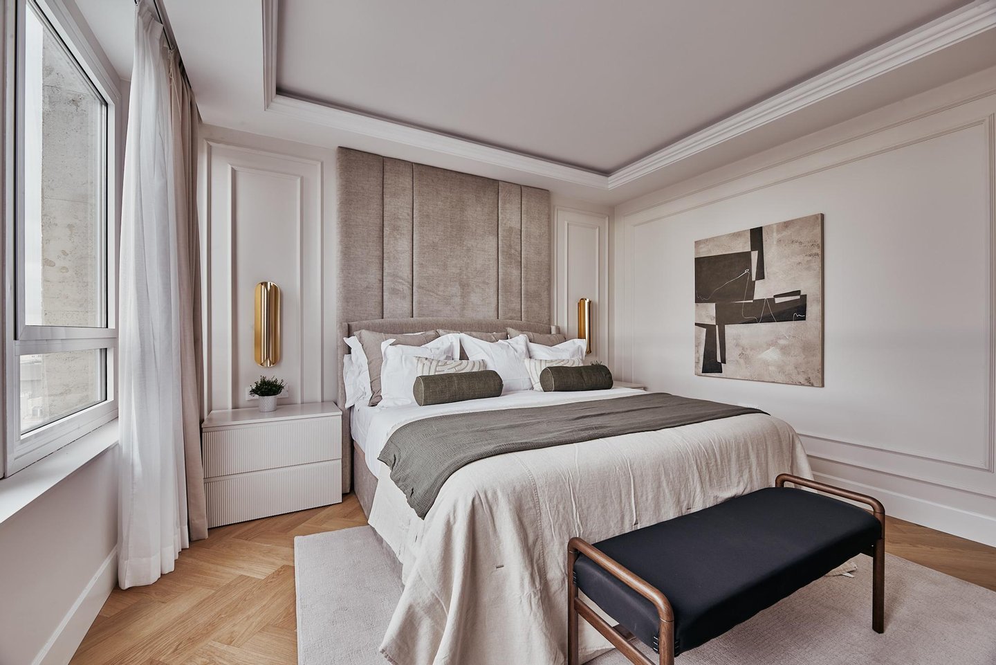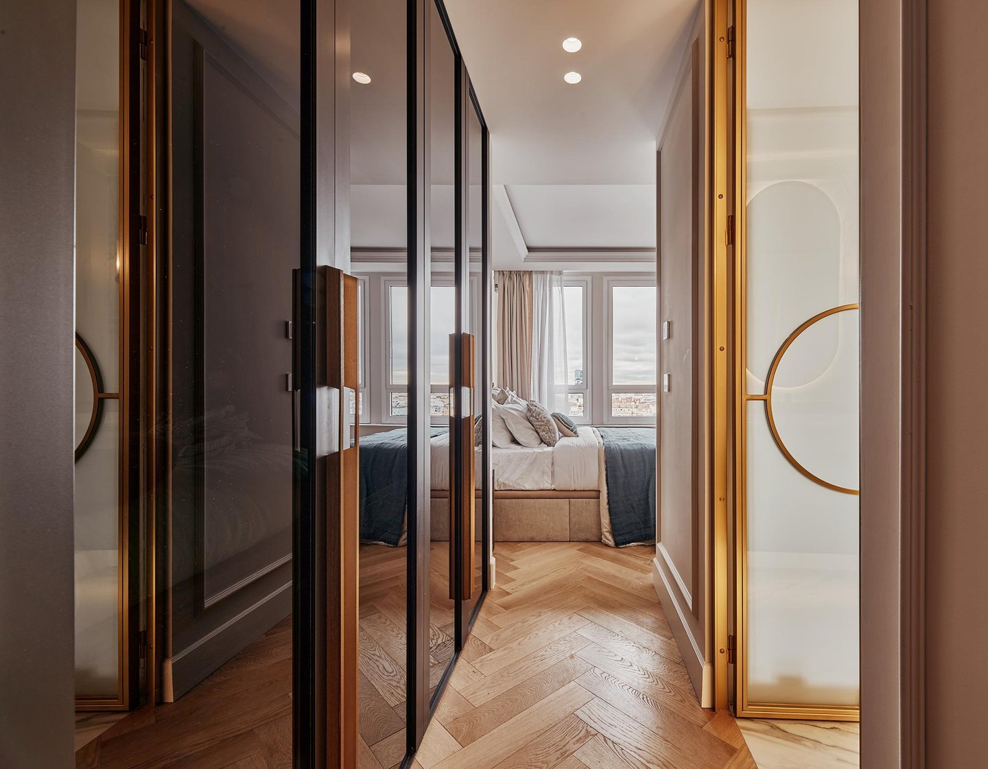 The comprehensive refurbishment has been carried out under contemporary luxury criteria, combining noble materials, custom-made carpentry and a careful interior design. The main space is articulated around a large high-rise living-dining room, conceived as the social core of the house and visually connected to the city in all directions. The main living room incorporates an integrated fireplace, which reinforces the feeling of home and brings warmth and character to the social area, even in an urban high-rise residence.