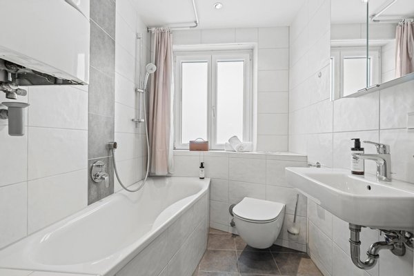 Das Tageslichtbad ist mit einer Badewanne ausgestattet und wird durch die effiziente Gasetagenheizung ergänzt.