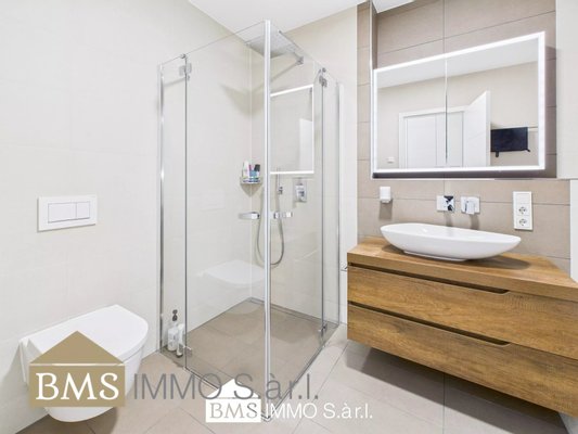 Das Badezimmer, mit einer barrierefreien Dusche und einer großzügigen Badewanne ausgestattet, lädt zur Entspannung ein.