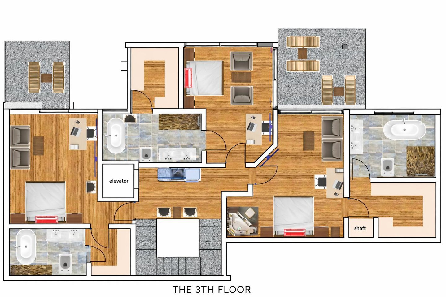 Eine komplette Wohnung mit zwei Schlafzimmern und zwei Badezimmern sowie eigenem Wohnzimmer, Esszimmer und hinterer Küche. Innen verbunden durch eine Wendeltreppe. Ideal für Gäste, Personal oder Mietwagen.Dachterrasse – Der Aussichtspunkt (97,5 m²)