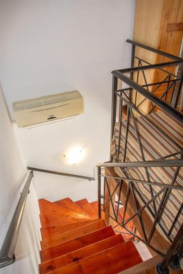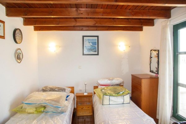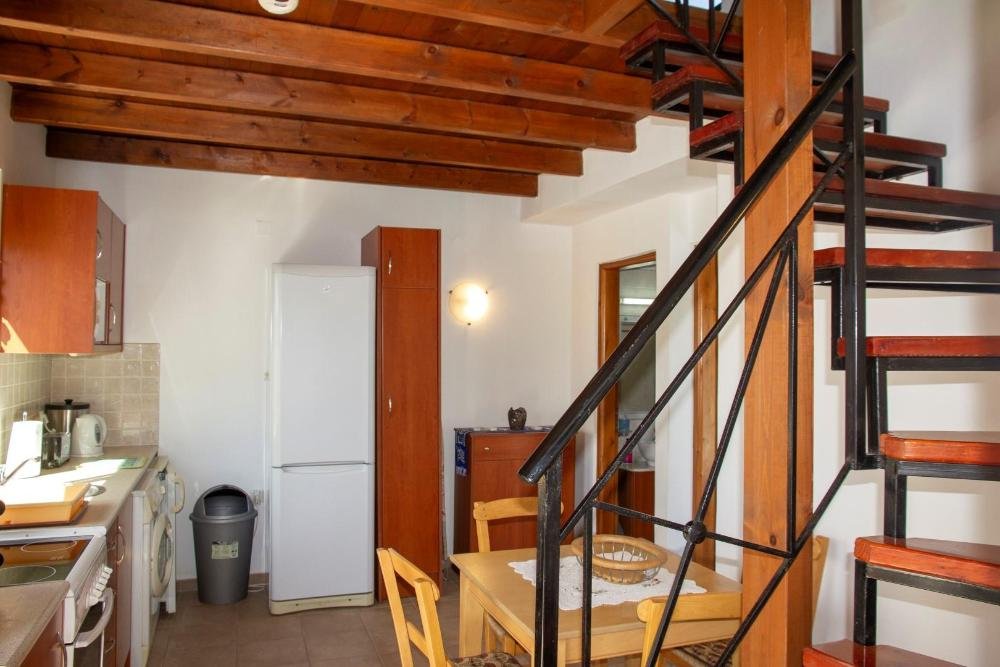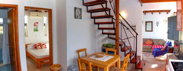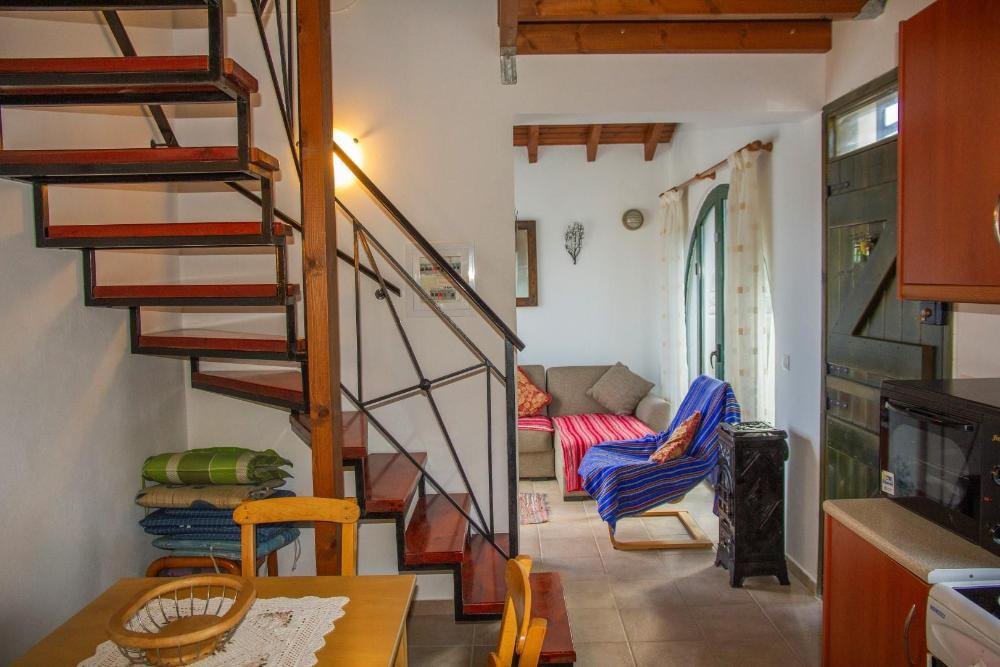 Eine eiserne Treppe führt zu einer Zwischenebene mit einem zweiten Schlafzimmer, das mit zwei Einzelbetten, einem Kleiderschrank und einem Holzboden ausgestattet ist. Dieses Zimmer öffnet sich zu einem nach Norden ausgerichteten Balkon mit Blick auf Olivenhaine und das Meer.