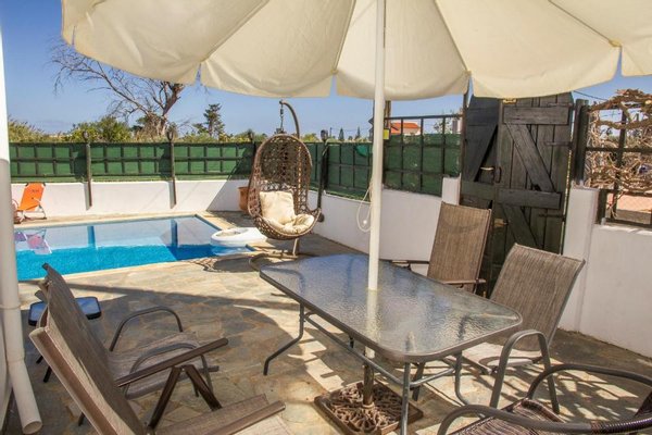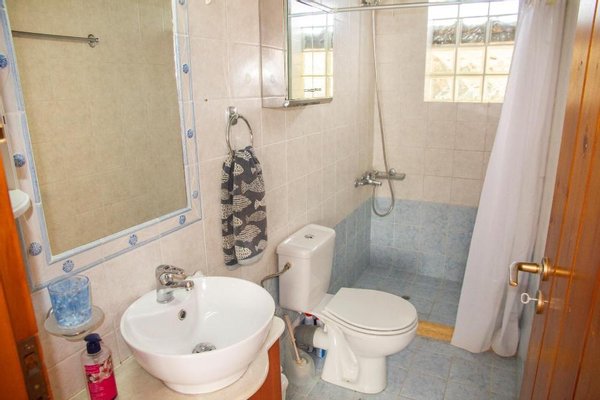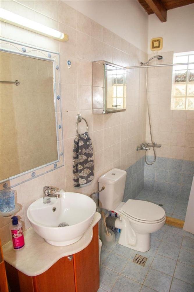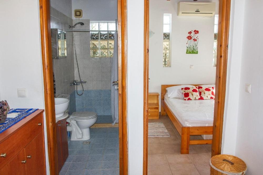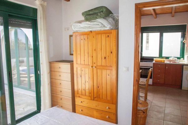 Das Erdgeschoss öffnet sich zu einem hellen Wohnbereich mit schräger Holzdecke und direktem Zugang zum Innenhof. Die Küche erstreckt sich entlang einer Wand und ist mit Schränken in Acajou-Farbe, allen notwendigen Haushaltsgeräten, einer Waschmaschine, einem zusätzlichen Kühl-/Gefrierschrank und einem kleinen Esstisch ausgestattet. Das Hauptschlafzimmer verfügt über ein Doppelbett, einen Holzschrank und eine Klimaanlage und öffnet sich zu einem privaten Innenhof neben einem blau-weiß gefliesten Duschbad.