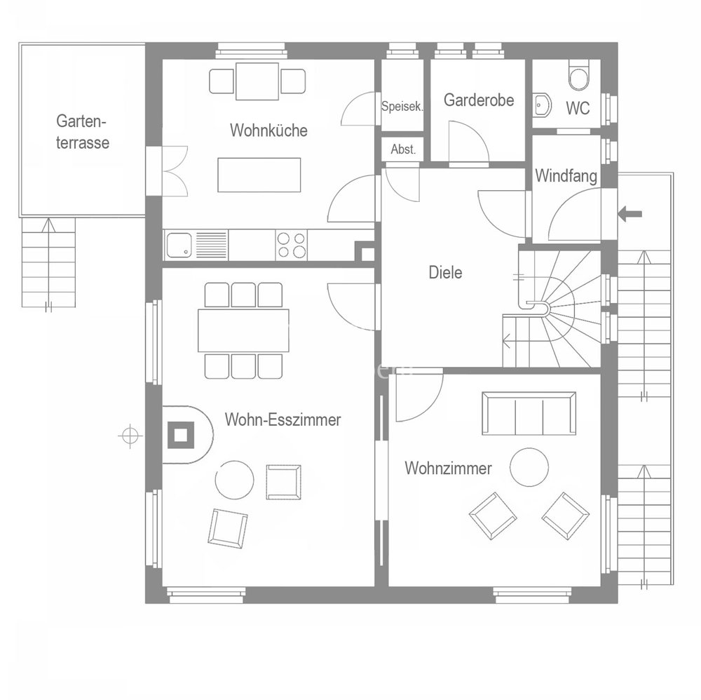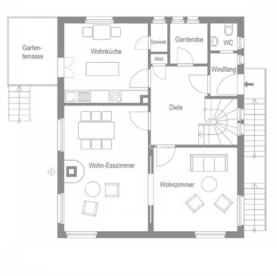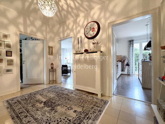 Das Haus bietet Ihnen 6 Zimmer, Wohnküche, 2 Bäder und Gäste-WC, die vielfältige Nutzungsmöglichkeiten zulassen. Der geräumige Wohn-Essbereich überzeugt mit einem gemütlichen Kaminofen und einer eleganten Schiebetür, die in ein weiteres Wohnzimmer, derzeit Lese- und Fernsehzimmer, führt. Die einladende und helle Wohnküche mit Insel ist mit einer Einbauküche ausgestattet. Am Esstisch genießen Sie den Blick in den Garten. Abgerundet wird das Erdgeschoss mit dem klassischen Windfang, Gäste-WC, Diele, Gartenterrasse, Abstell- und Speiseraum.